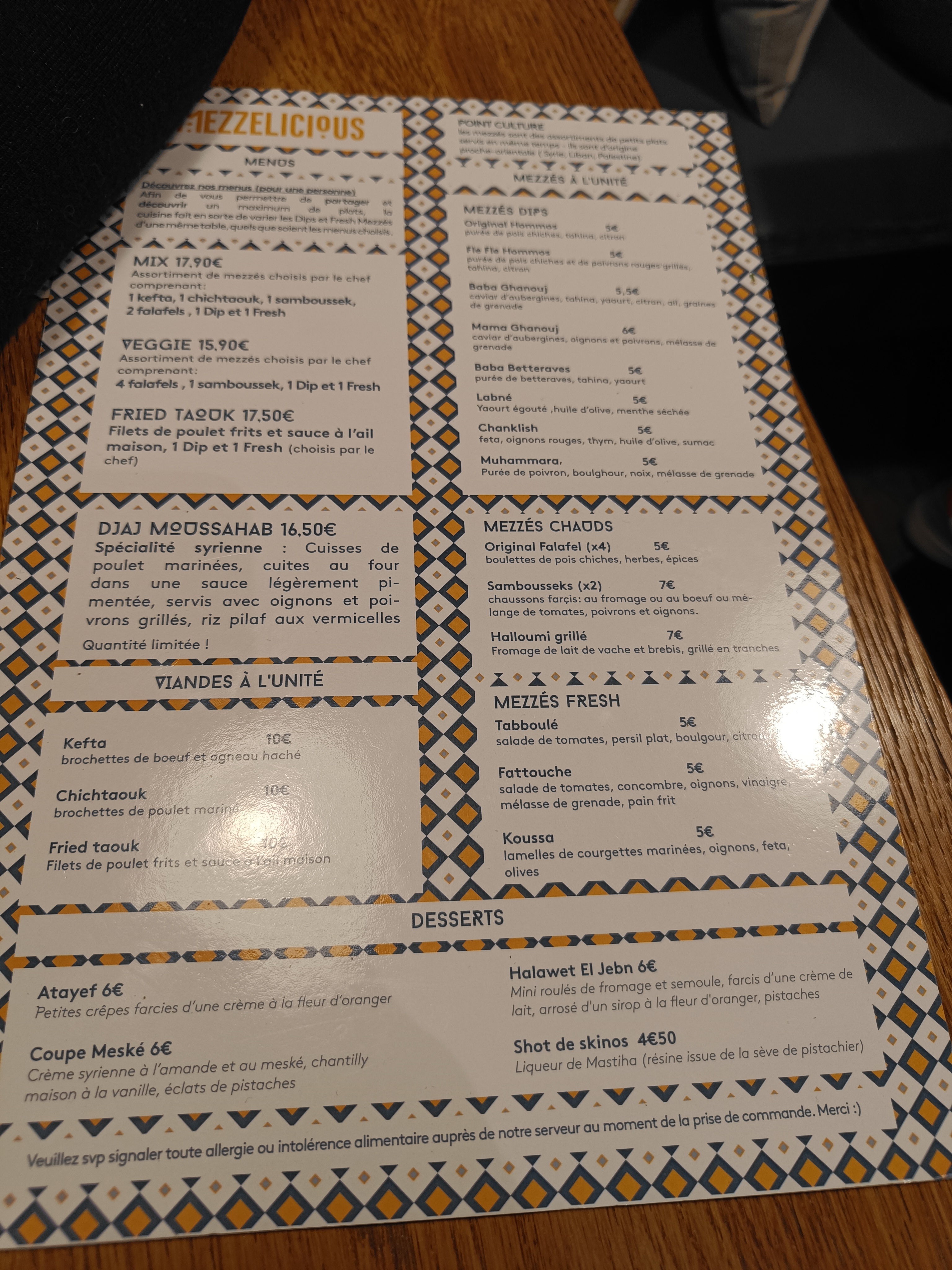 Très bon moment passé au Mezzlicious, des plats copieux et savoureux et une équipe accueillante et chaleureuse. Le tout pour un prix plus que raisonnable et dans un cadre accueillant. On y retourne avec grand plaisir !