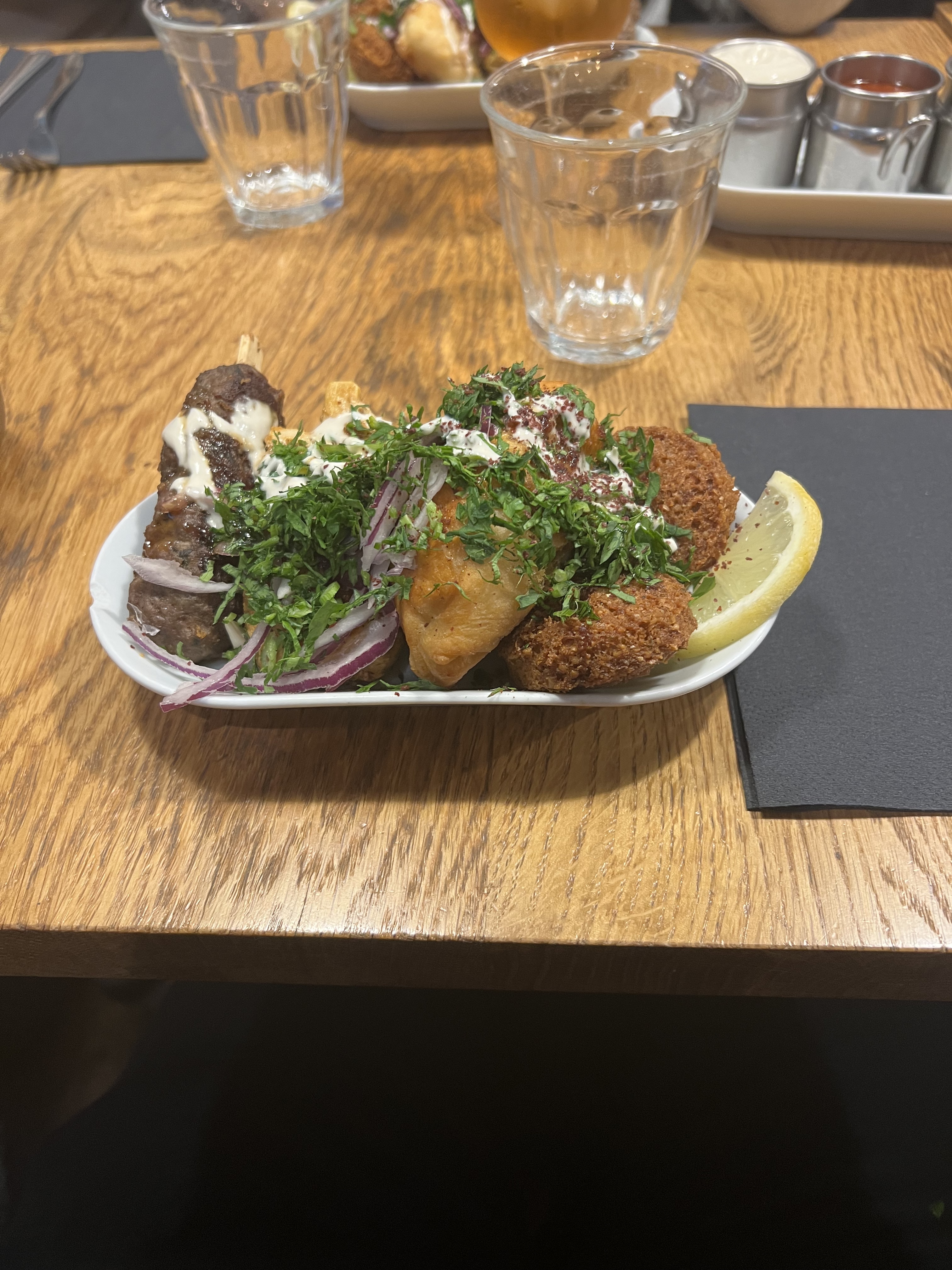 Un resto très sympa avec notamment une assiette mix avec 1 salade, 2 brochettes (kefta et poulet), plusieurs mezze chaud et 1 mezze froid. Copieux et délicieux je ne peux que recommander ! (Bonus : cette assiette est aussi proposée en version végétarienne)