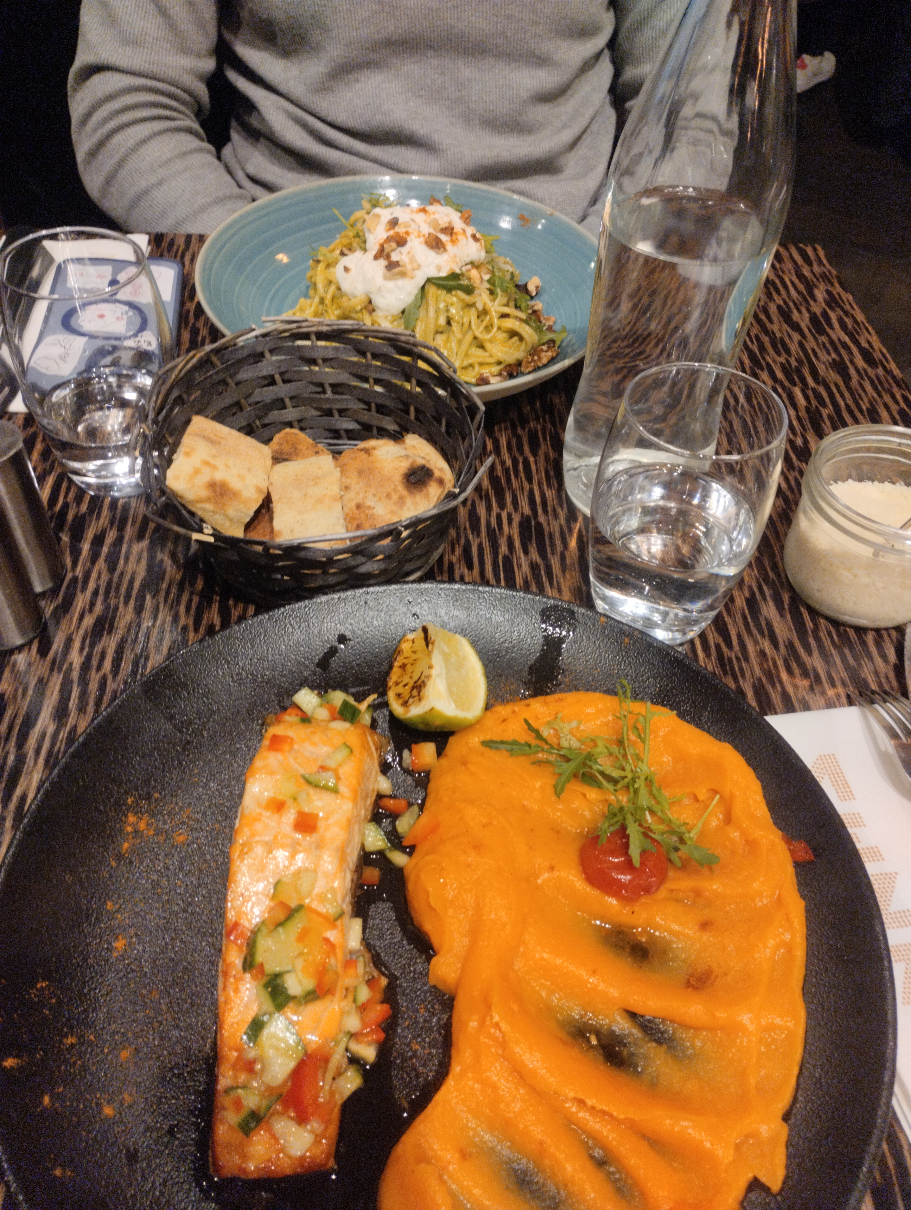 Un peu cher, un peu l'usine et encore une fois on attend pas que tout le monde ait fini de manger son plat pour retirer les assiettes de ceux qui ont fini, ce qui est assez malaisant, mais c'est bon. 21€ pour un tartare de saumon à la mangue avec des frites et de la salade, ça pique.