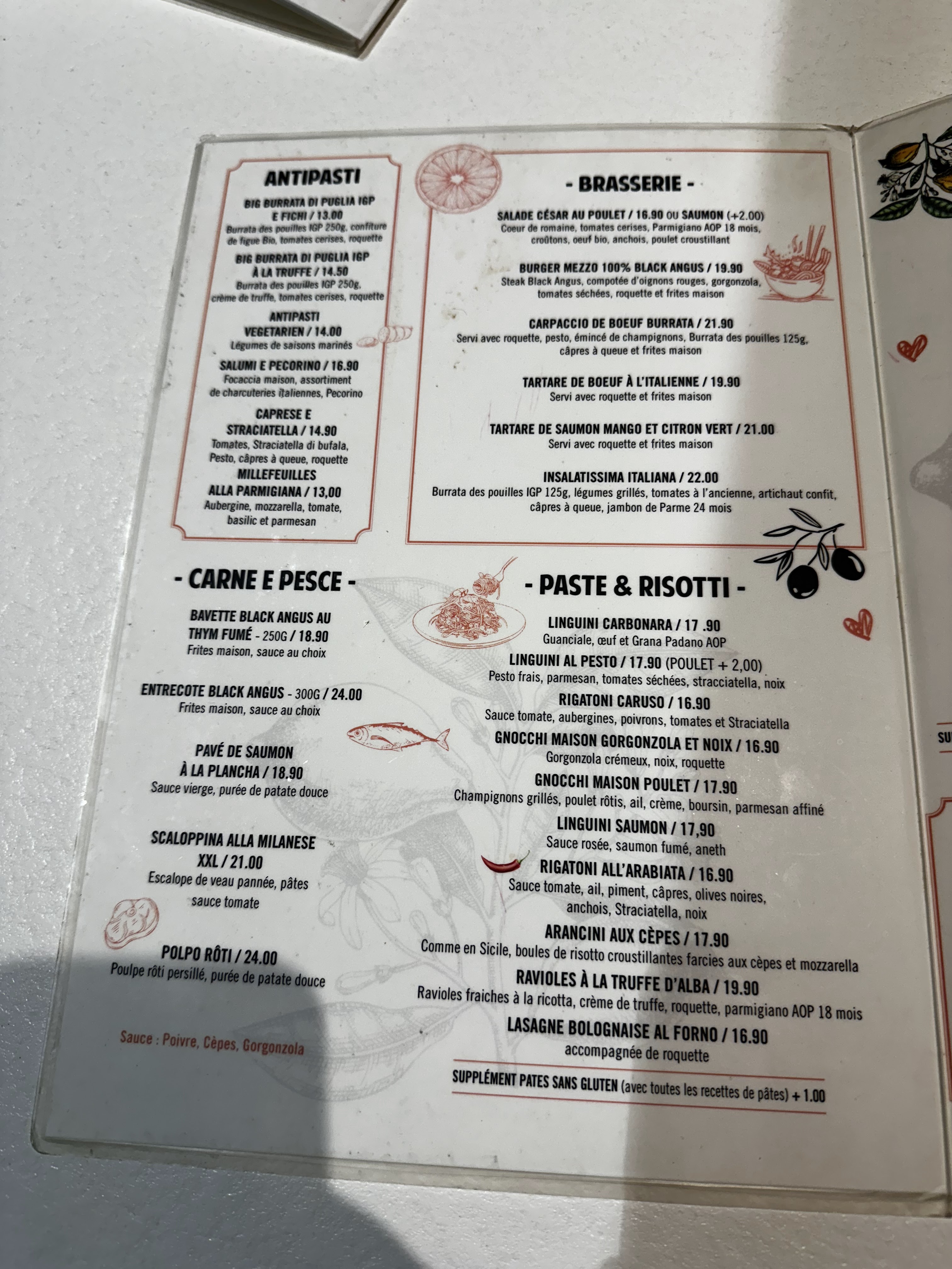 super bon mais attention au pichet de rouge fruité à 27€(50cl BARBERA D ALBA) restez sur la formule à 23€ et aller prendre quelque chose à boire à Monop juste à coté