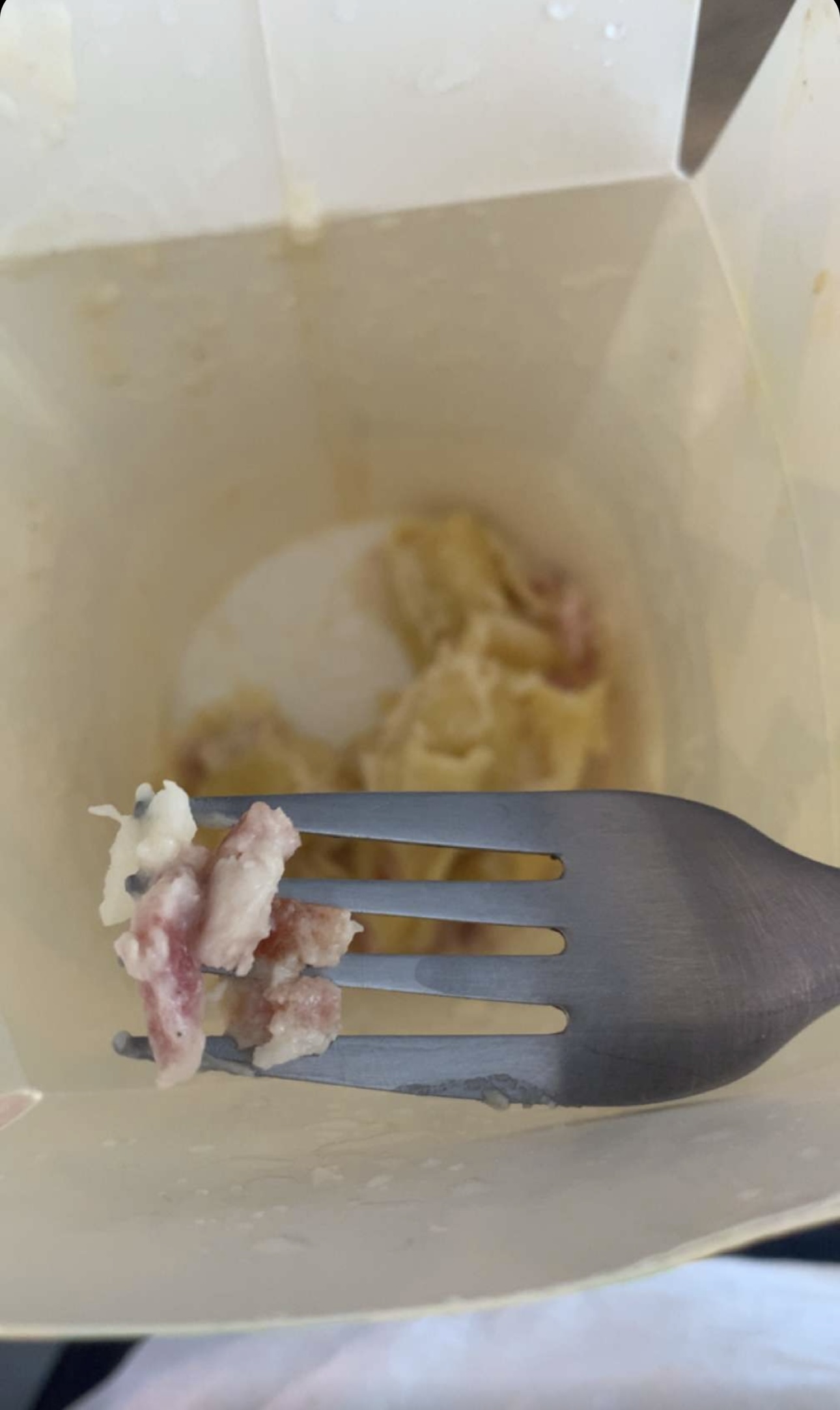 J’ai commandé a en emporté un plat de pâtes avec une sauce au saumon en prenant soin d’informer le vendeur que je ne voulais pas de viande dans mon plat. En arrivant chez moi j’ai commencé à manger avant de me rendre compte qu’il s’y trouvait du saumon ainsi que lardons ! C’est inadmissible et irrespectueux de mettre de la viande dans le plat d’une personne ayant précisé qu’elle n’en mangeait pas. Edit: Je me permet de modifier mon commentaire suite a la réponse du restaurant insinuant que j’aurais confondu du saumon avec des lardons. Je rajoute donc la preuve en image. Je pense être assez grand pour pouvoir faire la différence entre du poisson et de la viande. En plus de cela je tiens à préciser que pour écarter tout doute j’ai fait goûter la sauce a une amie qui elle mange de la viande et qui a pu confirmer avec moi qu’il s’agissait bien de lardons et que la sauce avec une odeur de sauce carbonara. Il semble bien que se soit une erreur de la part du restaurant, ce qui peut arriver. La moindre des choses serait de reconnaître l’erreur plutôt que d’essayer de rejeter la faute sur le client qui aurait « confondue » des morceaux de saumon avec des lardons.