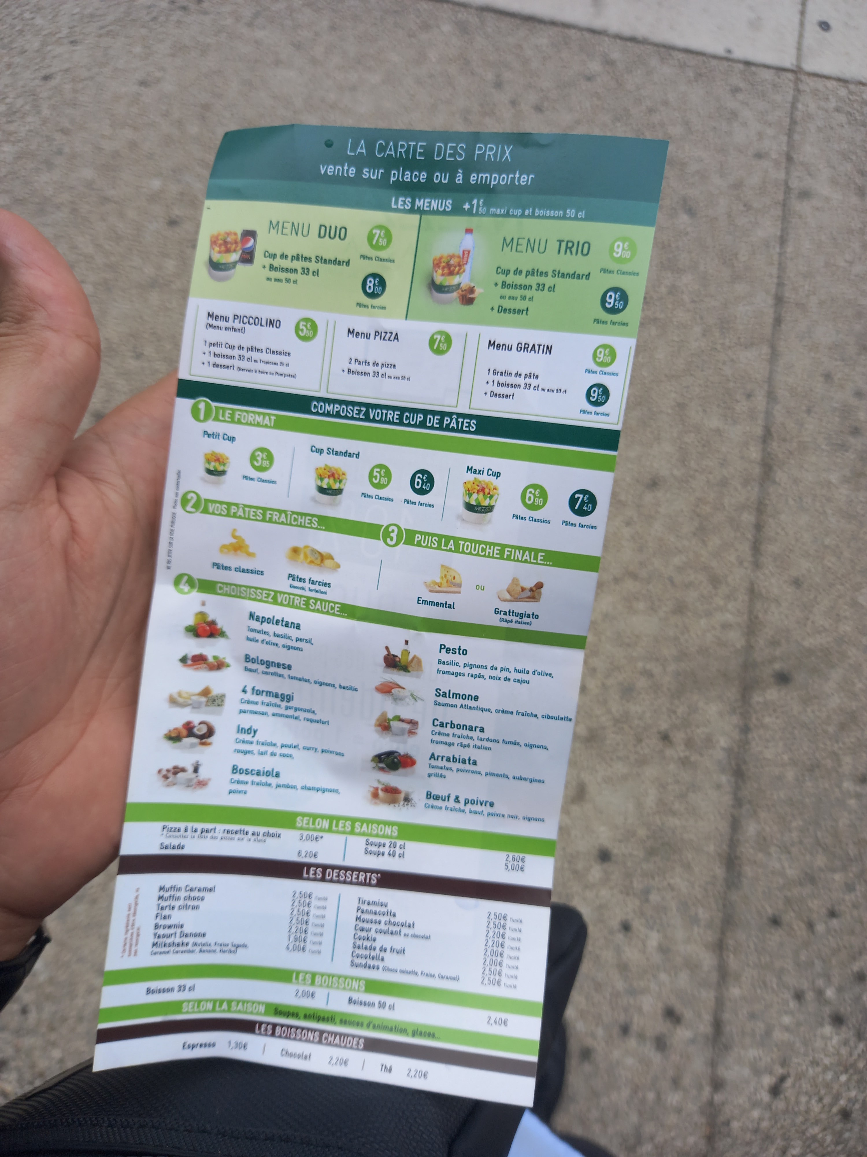 Des pâtes, rien d'exceptionnel. C'est rapide et ca remplit le vente. Pas mal de choix au niveau des pâtes et sauces. Emmental râpé ou Parmesan. Pas mal de desserts aussi, même des glaces. Pas contre l'accueil et le service, pas terrible. On se sent agressé à peine arrivé Vous avez choisi? Farci, pas farci? Normal, maxi? Par une personne même pas derrière le comptoir et qui ne fait que répéter ce que l'on dit aux autres, et plusieurs fois même, ce qui crée des erreurs de commandes. Ensuite box servie avec de la sauce sur l'extérieur de l'emballage, et pates à peine égouttées... Peut mieux faire même pour du fast food