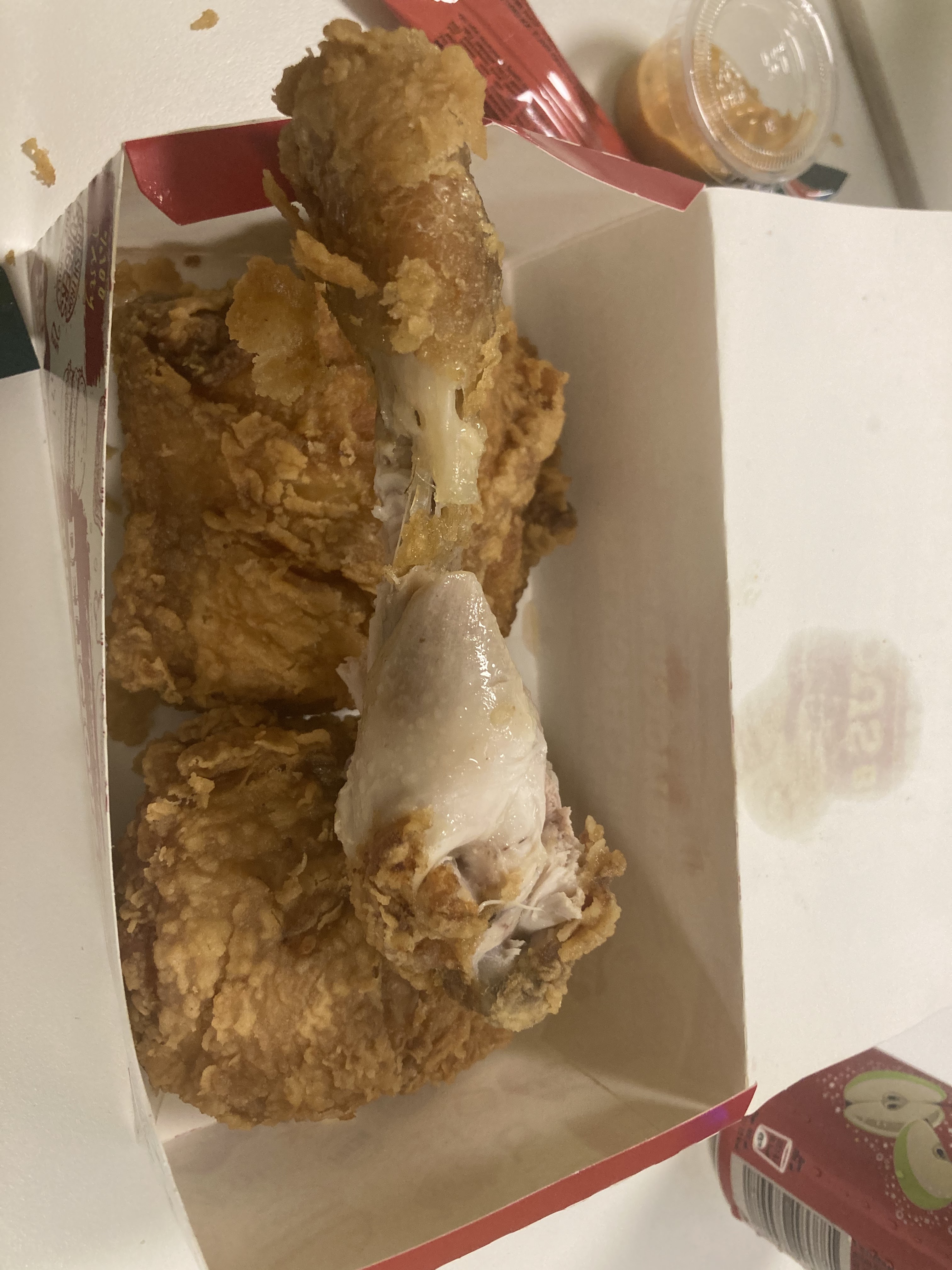 Poulet beaucoup trop cuit et sec Très étonnant pour du poulet frit car la friture est sensé attendrir le poulet En tout cas c’est la dernière fois que je commande chez eux En plus j’ai pris un gros de poulet qui a fini à la poubelle