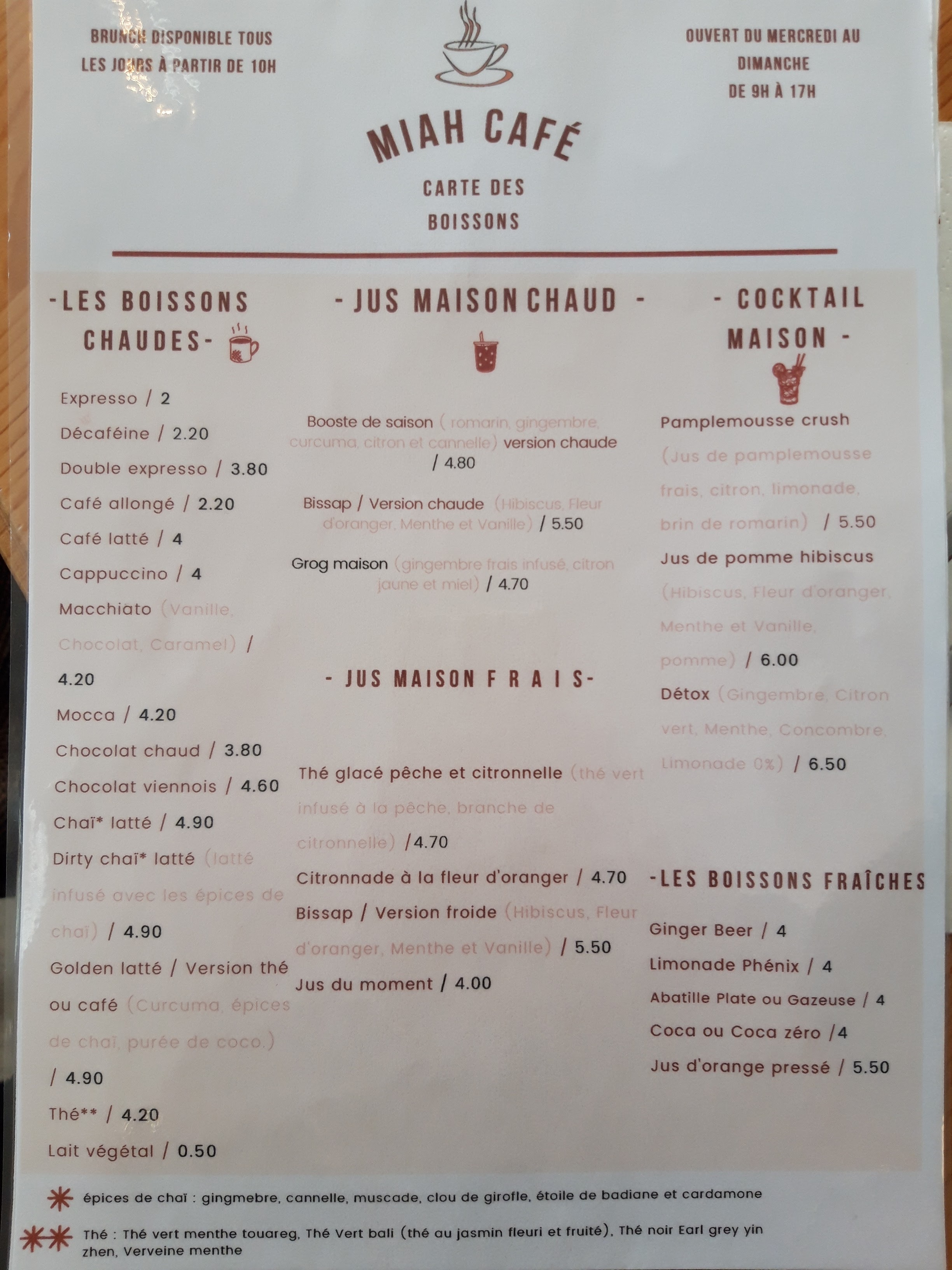Chez Miah Café, on vous précompose des brunchs à 24€ avec plat salé + plat sucré (3 choix sucrés), boisson chaude et boisson fraîches 🥞 En +, ils proposent de la variété dans les choix de brunchs: le végétarien, le végétalien et le carnivore. Si vous voulez changer quoi que ce soit, ce sera en supplément ! Vous n’y trouverez pas tous les basics d’un brunch (par ex du bacon) mais l’originalité de leurs recettes en vaut le détour 😉 La cuisine est bonne, les produits frais, les plats savoureux, les recettes recherchées, le service très rapide et les serveuses sont aimables comme tout, on y a passé un très bon moment entre copines en y restant 2h30 un dimanche fin de matinée☺️ Venez en profiter car c’est une adresse à tester et vous ne serez pas déçus 😊