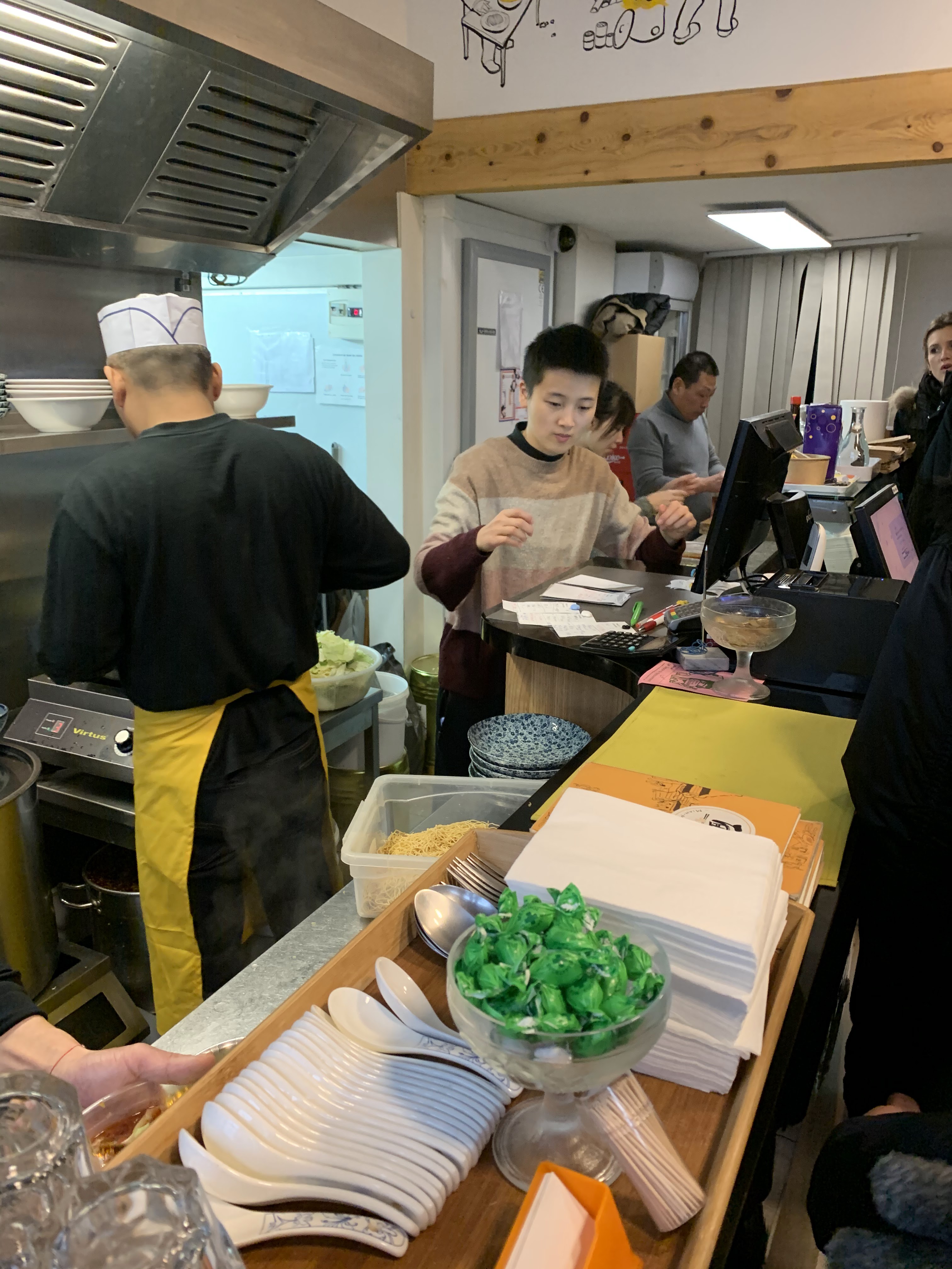 Beaucoup de clients, un peu d’attente en début de soirée mais ça tourne vite. Service efficace et table partagée Dommage que le bouillon ne soit pas plus goûteux. Idem pour les raviolis qui manquaient de saveurs