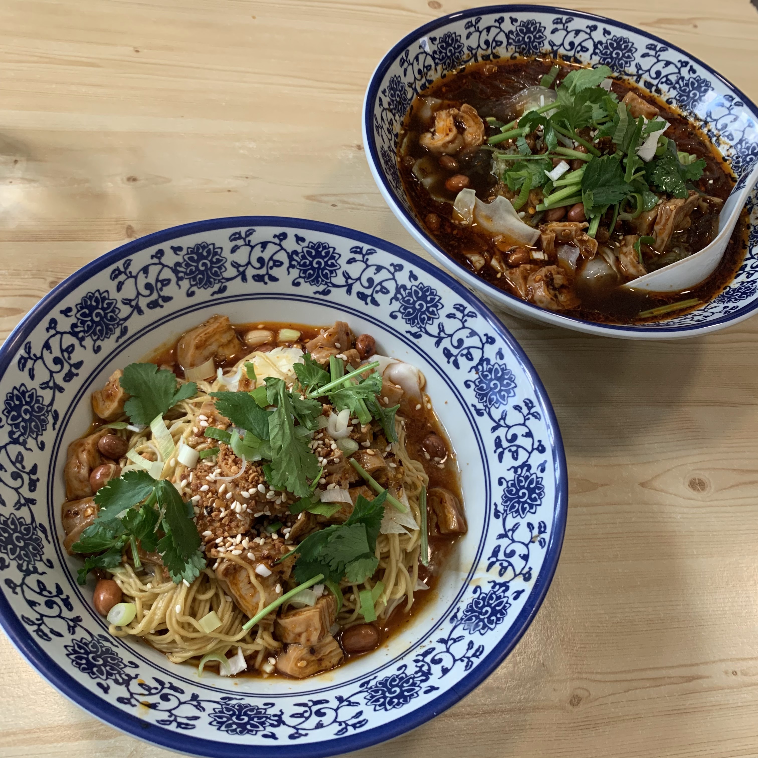 Nouilles pimentées sans ou avec bouillon. Tout est frais. Il faut insister auprès du serveur pour avoir une bonne dose de piment si l'on a une tête d'Européen.