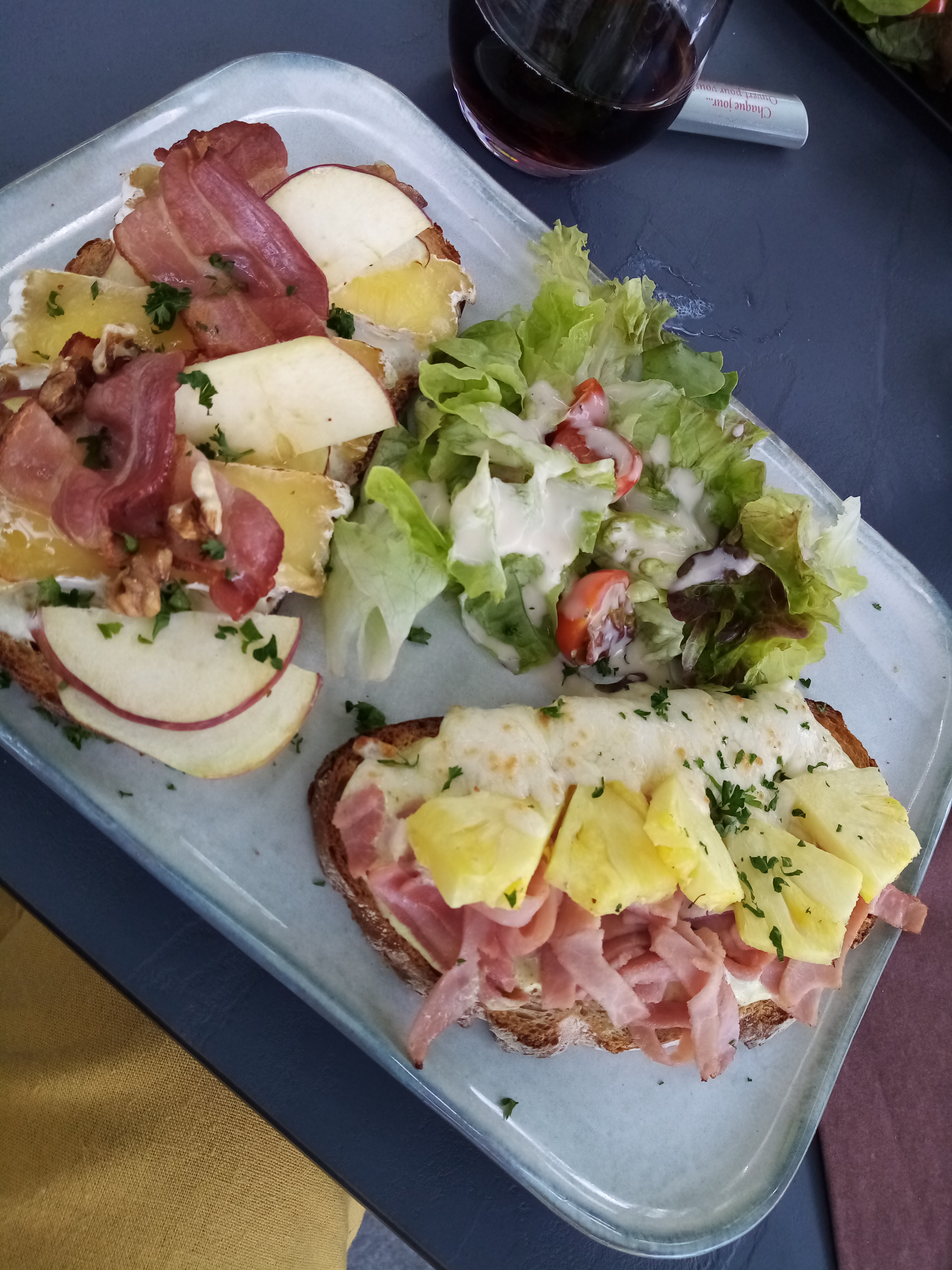 Accueil sympathique. Duo de tartines Normande et Hawaïenne bien copieuses et très goûteux... Et le brownie un supplice.. 😋. Bon rapport qualité prix.