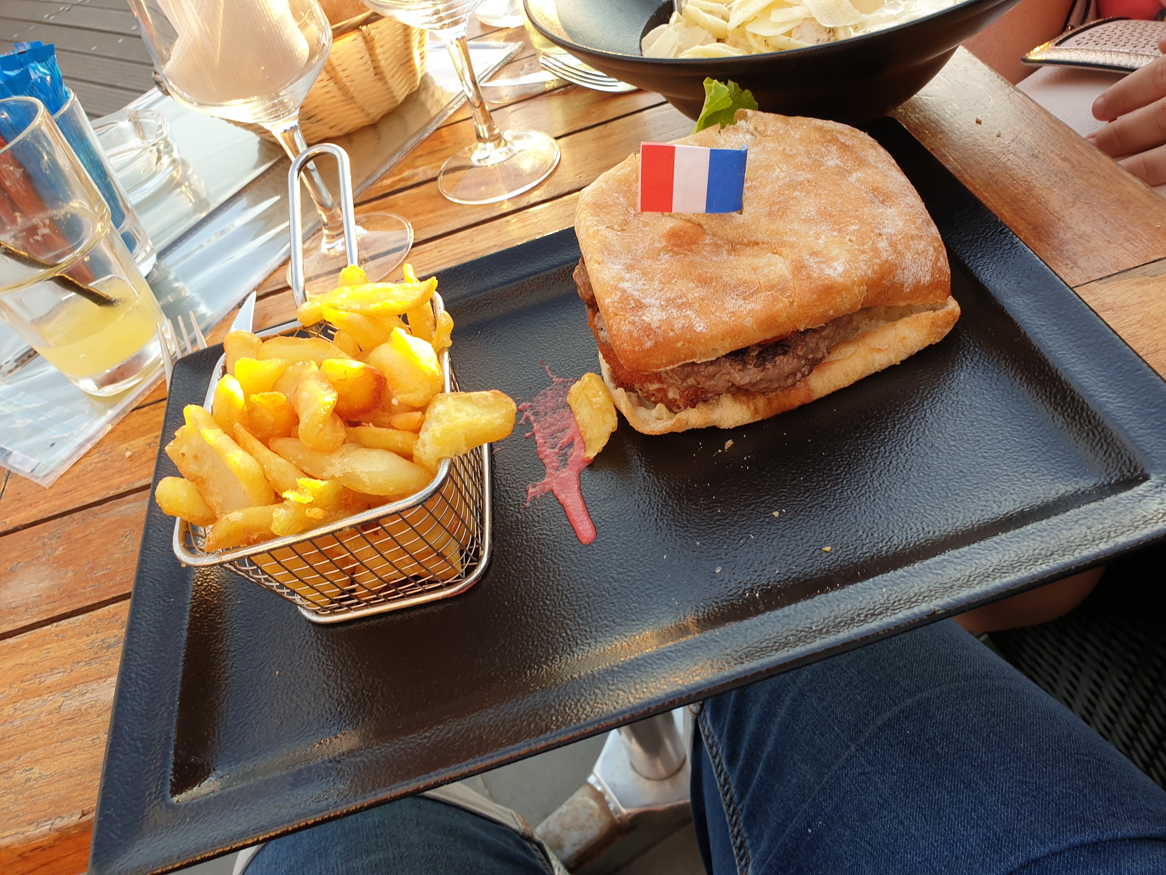 Serveuse souriante et aimable ! Le repas bon mais pas ouf, le hamburger était bon mais les frites trop cuite. Le cocktail était bon. Mais les prix sont exorbitant 5€ un coca et 3€ un café, l'impression d'être a st Tropez...... Dommage.
