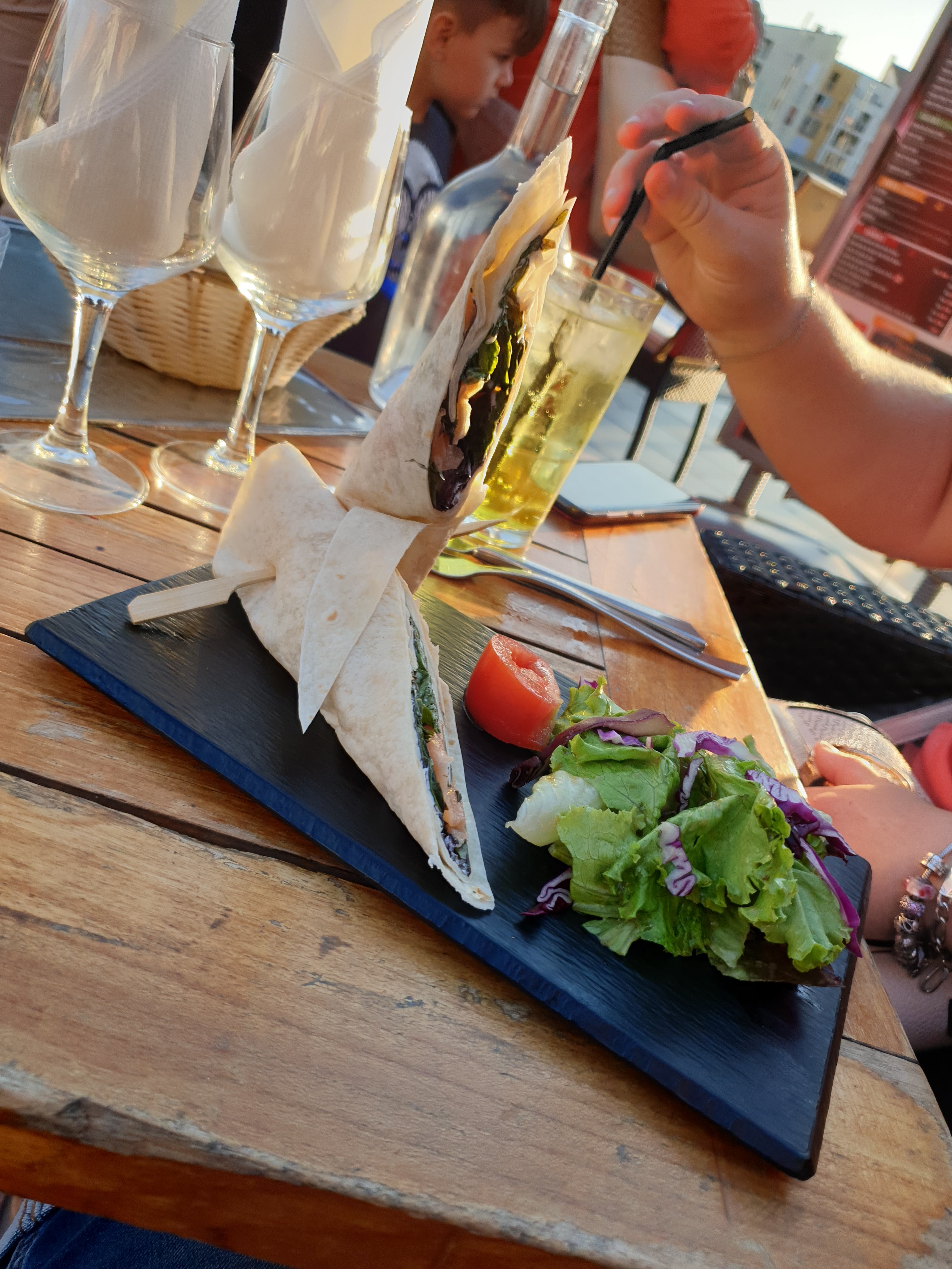 Repas excellent. Un menu adulte acheté et un repas enfant offert (c est bien cool ça) Par contre on me dit que l'apéro est offert pour moi étant donné que j'étais seule avec mes enfants.... non non j'ai bien payé l'apéritif (pas bien les mensonges pour attirer les clients) Sinon c etait très bon, bien placé