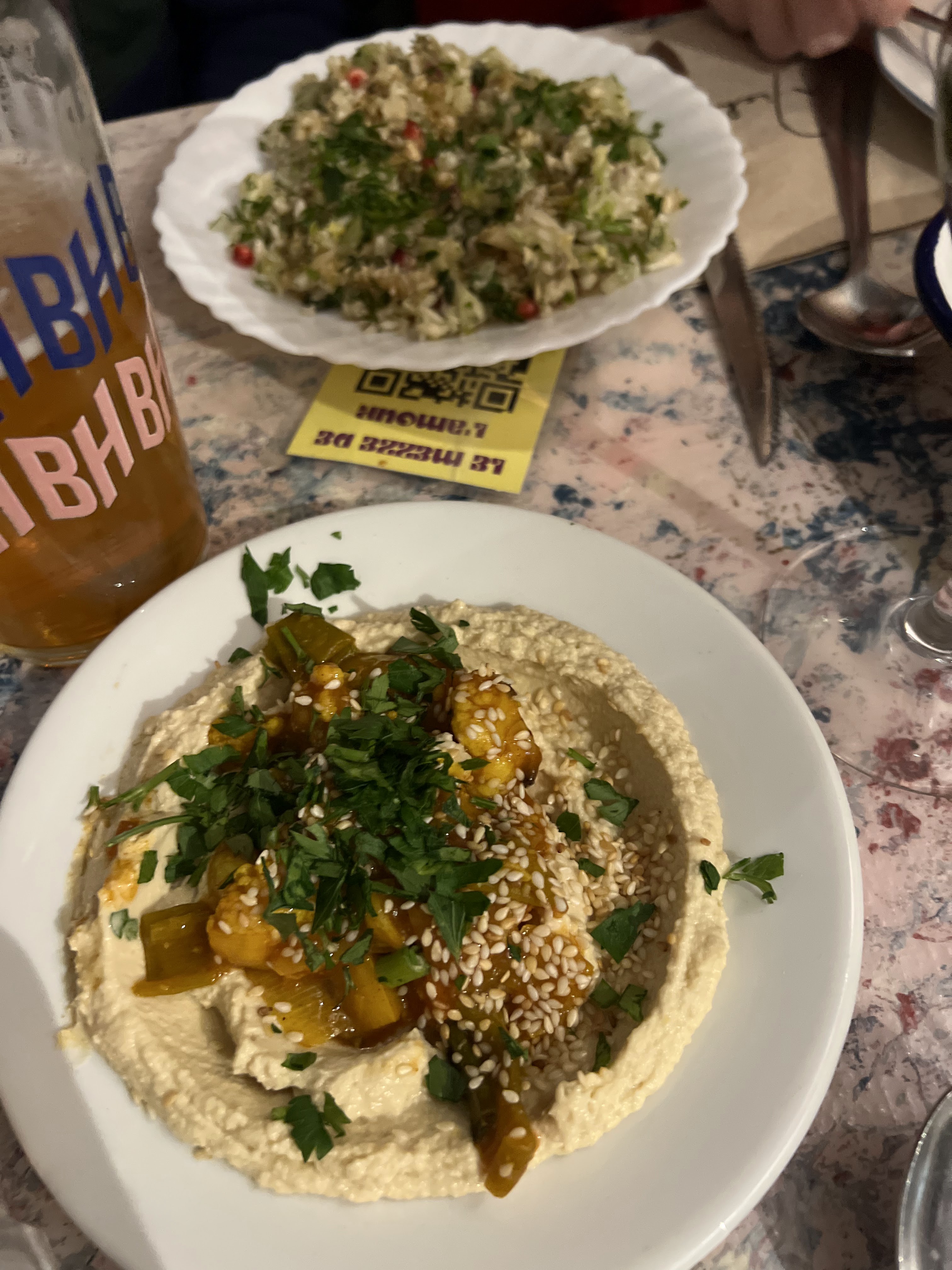 Un excursion au Liban pendant deux heures ! Le mezzé du soir permet de découvrir différents plats à partager. C’est généreux, convivial et bon.