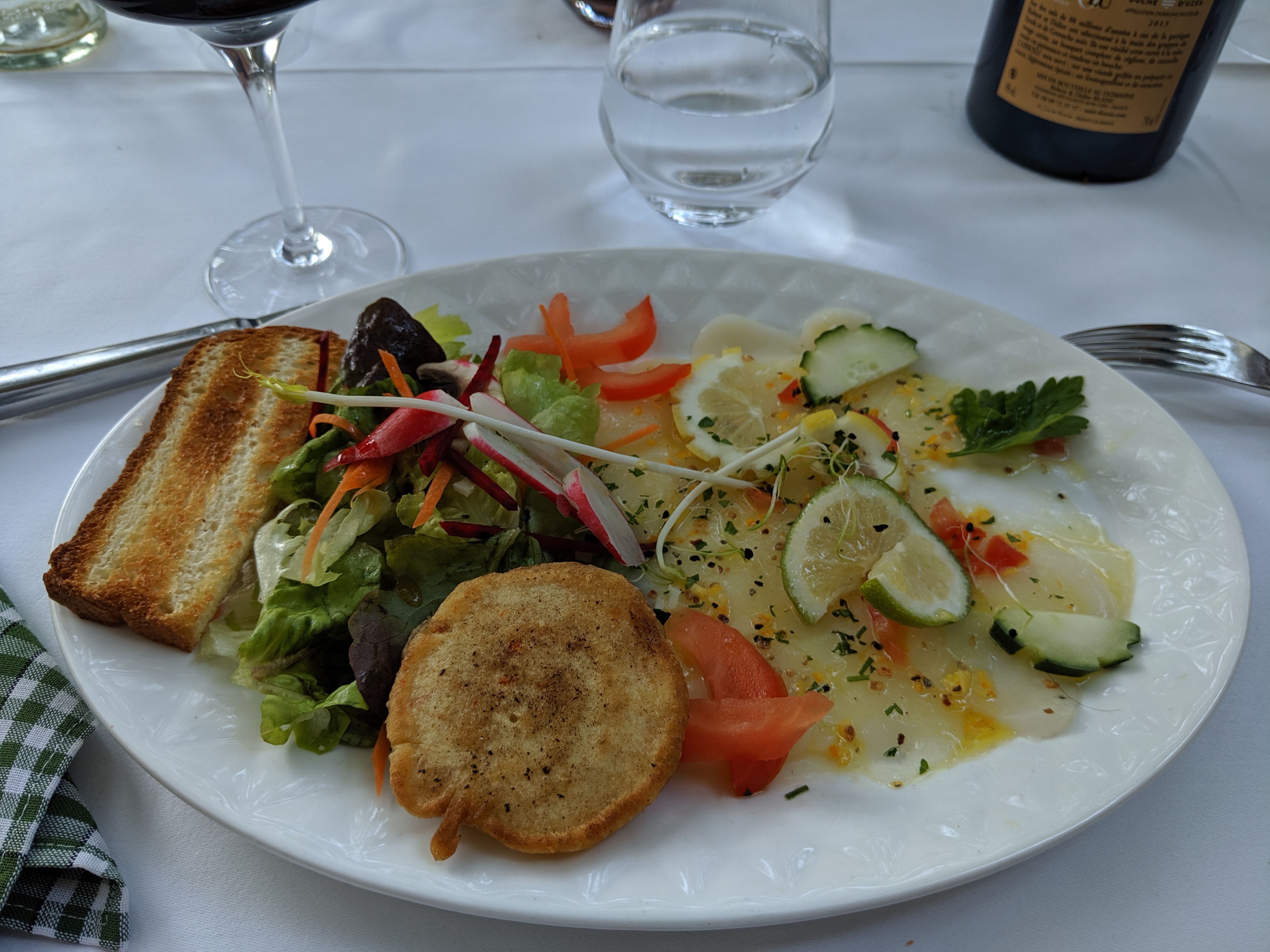 Ma famille a mangé dans ce petit bijou de restaurant à plusieurs reprises au cours des trois ou quatre dernières années. Nous y retournons car l'ambiance est géniale, la nourriture excellente et le service impeccable. Le repas que nous avons pris fin mai 2019 était le meilleur à ce jour. L'entrée carpaccio de pétoncles séchés à la vodka (photo) était mon plat vedette mais le steak que j'avais pour mon plat principal était également parfait. Je ne suis pas habituellement une adepte du pudding mais le sorbet parfumé à l'eau de rose et aux fraises était parfait pour moi. Nous avons pris une bouteille de vin rouge avec le repas - L'Absolu du Domaine St Firmin, qui se trouve peut-être à 200 mètres du restaurant. C'était incroyable - j'ai déjà bu du vin de la rue Firmin, mais aucun n'est aussi bon que celui-ci. Je vous recommande fortement d'essayer ce restaurant.