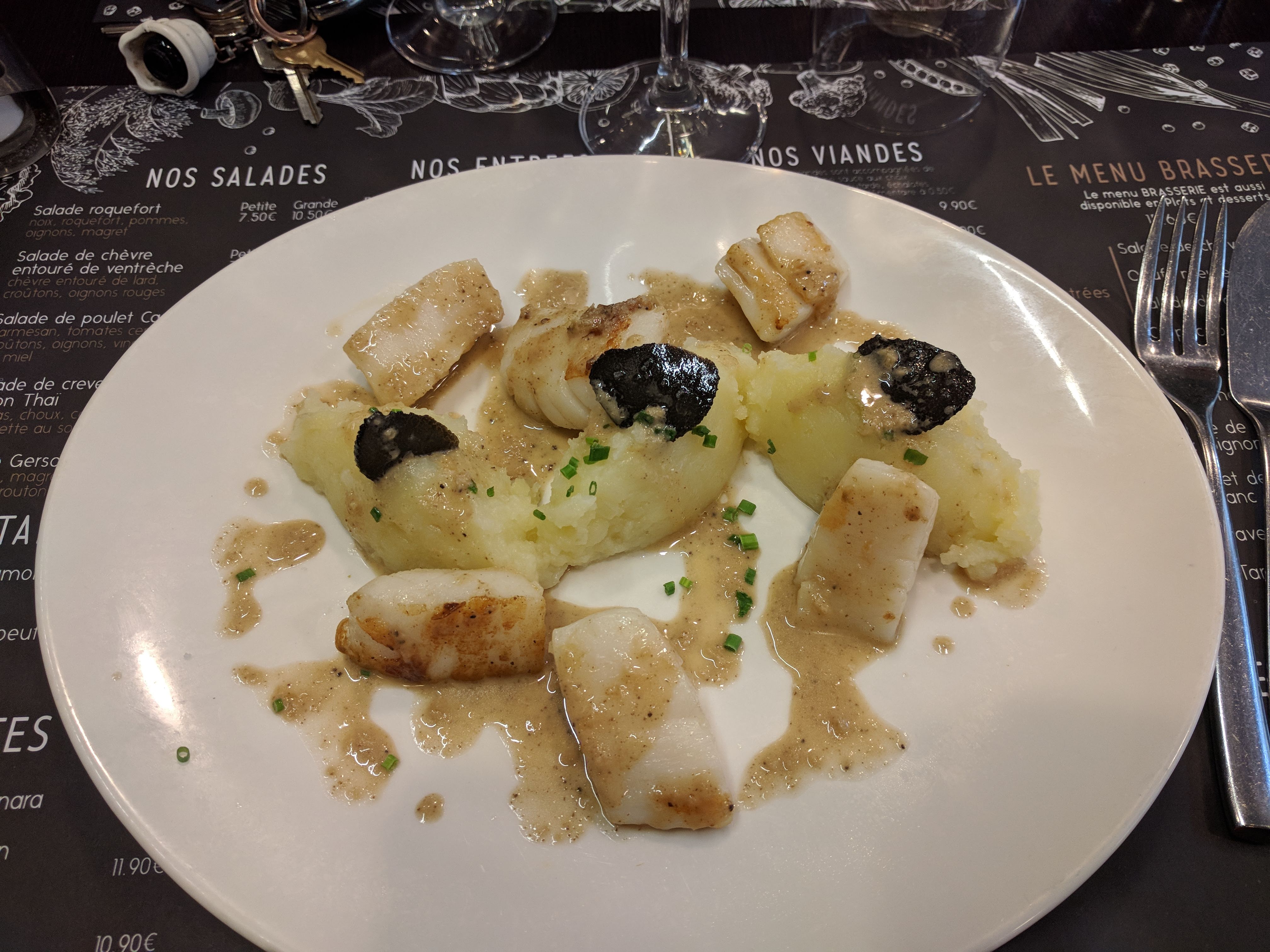 Déjeuner excellent. Des encornet persillé avec de très bonne frites allumettes. Et des profiterole avec une sauce au chocolat pas trop sucré comme j'apprécie. Juste les profiteroles il y en avait peut être trop après le plat pour nous.