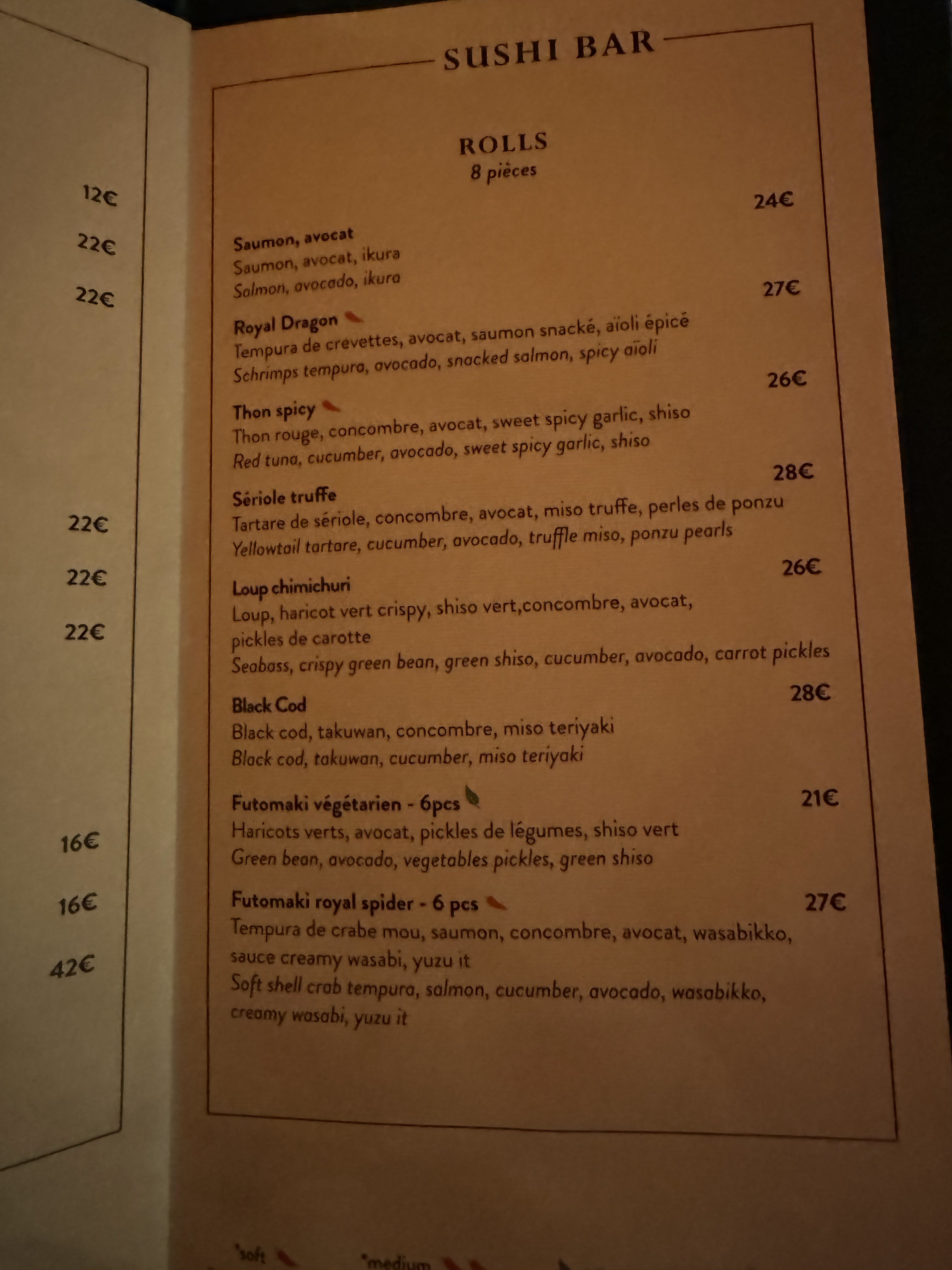 Brillant! Un lieu exceptionnel à l'ambiance jeune et chic servant une somptueuse cuisine japonaise moderne. J'ai adoré leurs cocktails et leur nourriture également et le service est tout simplement merveilleux. Luca a fait un excellent travail et nous a divertis avec son humour et son esprit. Hautement recommandé