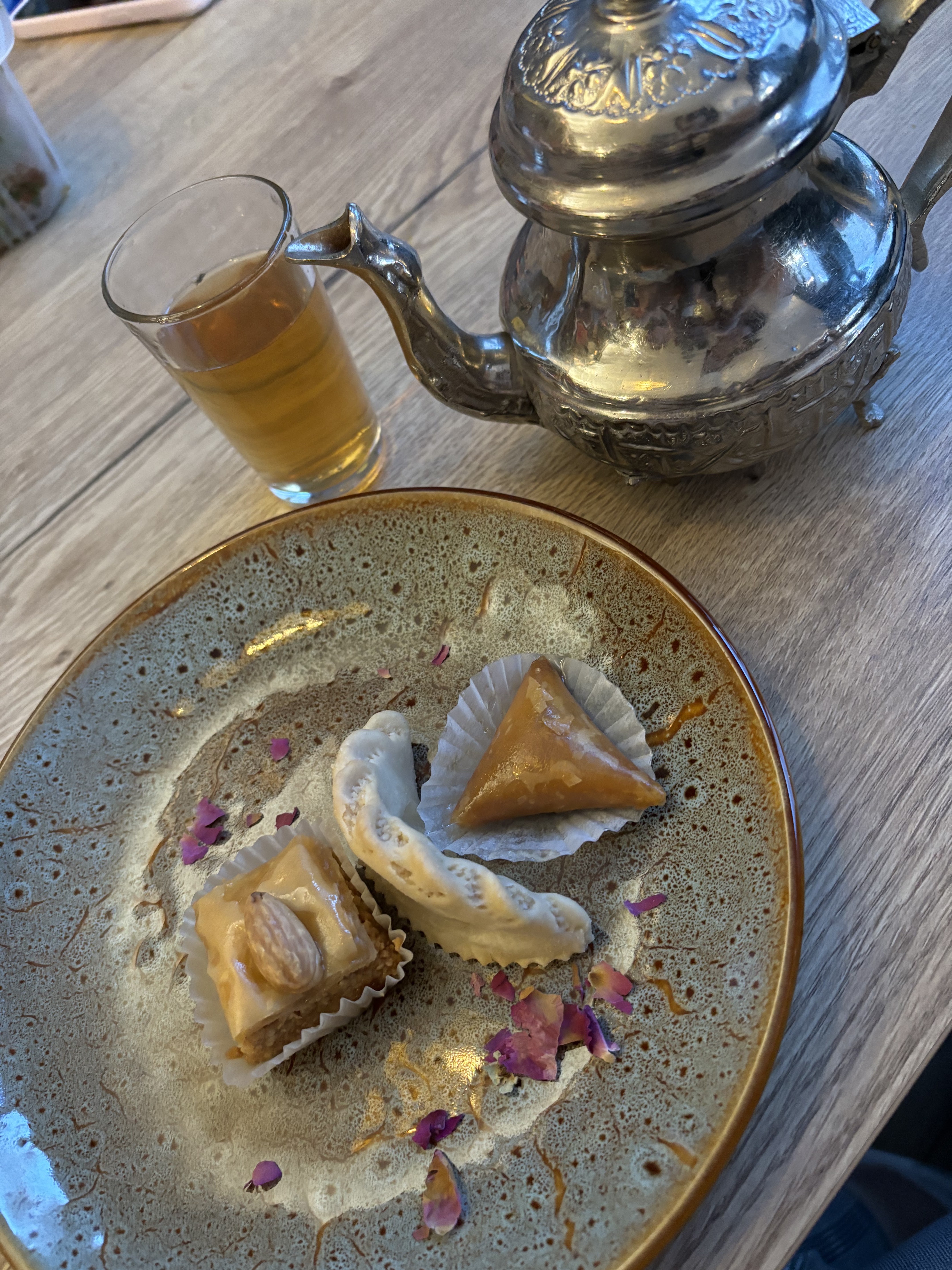 Un restaurant que nous ne connaissions pas, et nous avons adoré ! Après un apéritif (kir Miel et Safran très sympa), mon conjoint et moi même avons pris un tajine raisins secs, miel et cannelle ; moi avec du boeuf, lui avec du poulet. C'était excellent, bien dosé en goût, copieux ! Nous avons ensuite pris un thé à la menthe chacun et des pâtisseries orientales, qui étaient très bons également. Le service est super, on nous a offert une pâtisserie orientale et on nous a proposé le reste de nos plats en doggy bag. Par ailleurs, la déco et l'ambiance sont très chaleureuses, on s'y sent tout de suite bien. Je recommande vraiment ce restaurant qui va devenir un de mes chouchous des environs 😇