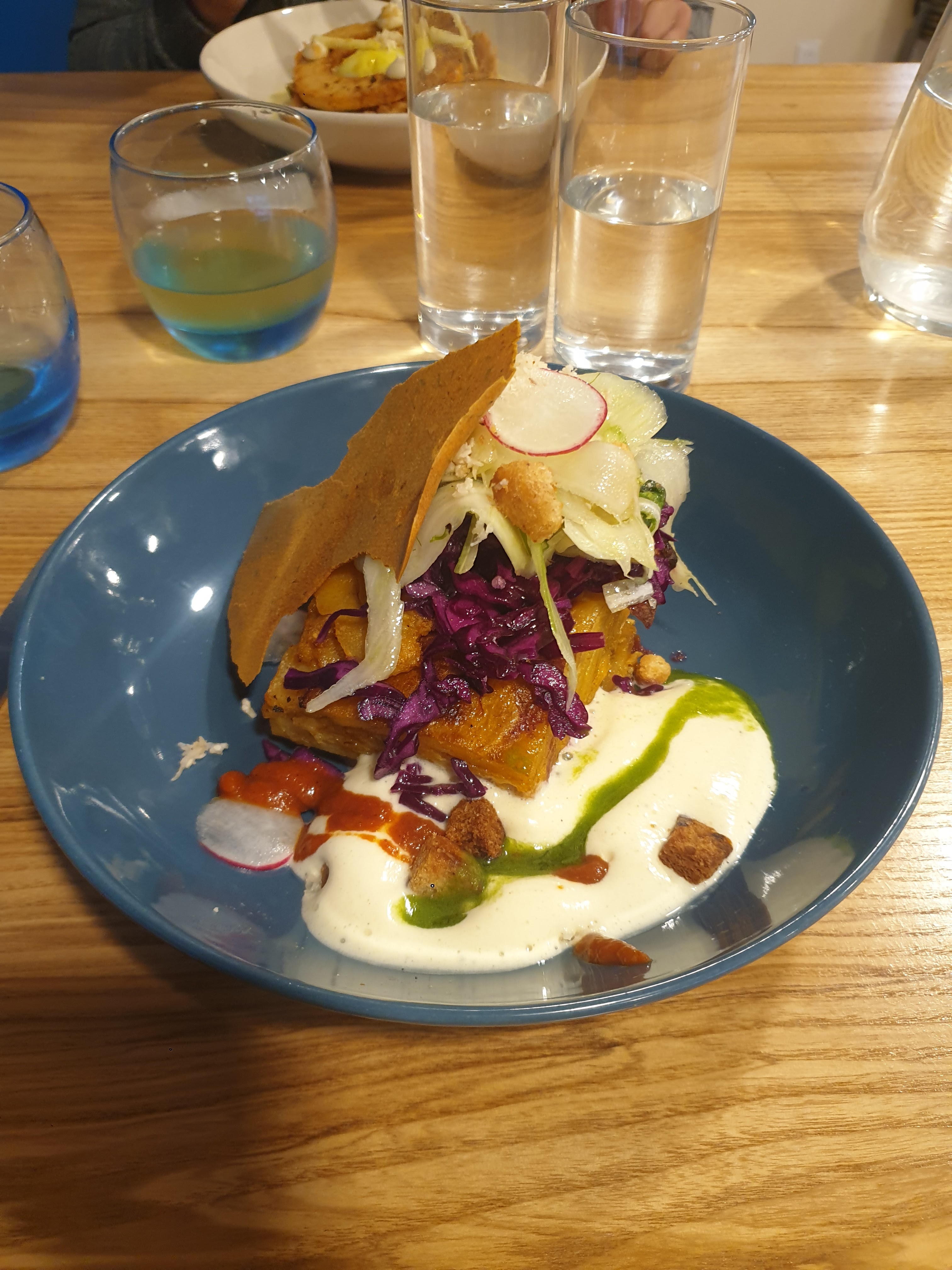 Nous sommes venus suite au bouche à oreille, et n'avons pas été déçus !!! On pourrait se dire seulement 3 choix d'entrées, 2 choix de plats chauds, 3 choix de desserts.... Mais quoi choisir quand tout fait envie ?? Et qu'on sait que tout est frais et fait sur place, plus ou moins à la demande. Émincé de courgette crue enroulée autour d'un mélange de dés de melon/pastèque accompagné de carottes fumées, fenouil mariné, purée de céleri.... Quant au plat de polenta aux dés de tofu qui pourrait paraître banal sur le papier, c'était un mélange d'une quinzaine de subtiles saveurs et presque d'autant de sensations en bouche niveau consistance, du cru bien croquant des radis à la mollesse de l'oignon confit en passant par l'aubergine grillée aux herbes de Provence, ..... Et j'en passe tellement il y avait de quoi se questionner.... les plats très souvent accompagnés de crackers maison aux couleurs et graines variés !!! C'est une vraie ode à la découverte et au plaisir sensoriel. Bel accueil en prime.