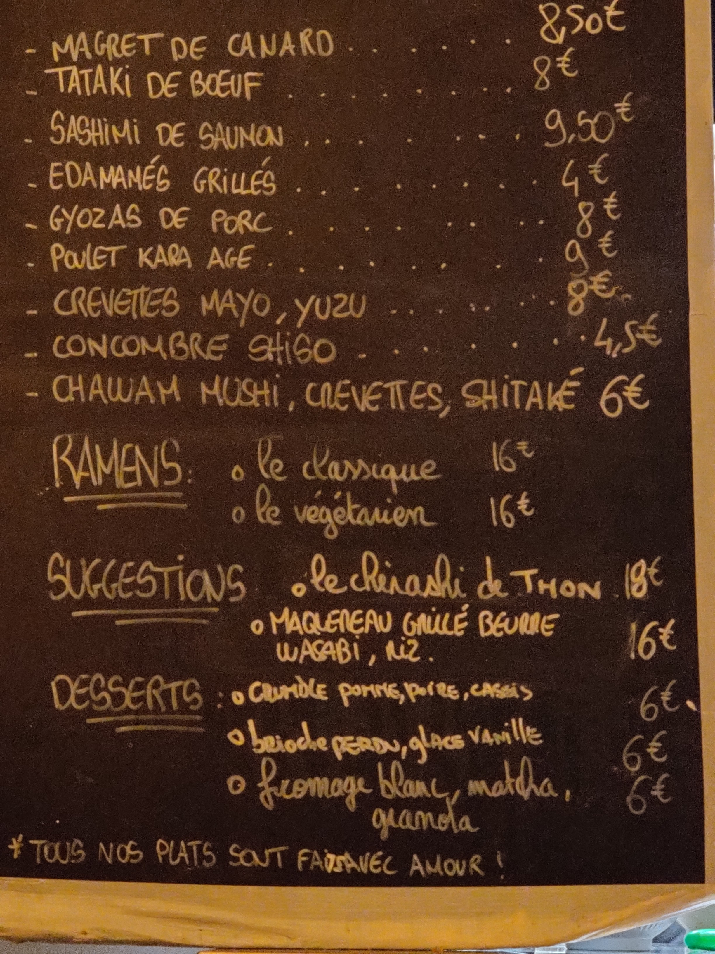 Quel plaisir ! Les chefs proposent une cuisine inventive et juste aux goûts à la fois puissants et délicats, raffinés et durables. Généreux, on vous propose de goûter leurs merveilleux gyoza quand on hésite avec leur magret de canard et la bonite. Plats gourmands, joyeux qui renouvellent les classiques comme les ramen froides au yuzu et le tonkatsu qui rivalise avec les meilleurs bento tokyoites. A me refaire revenir souvent à Montpellier.