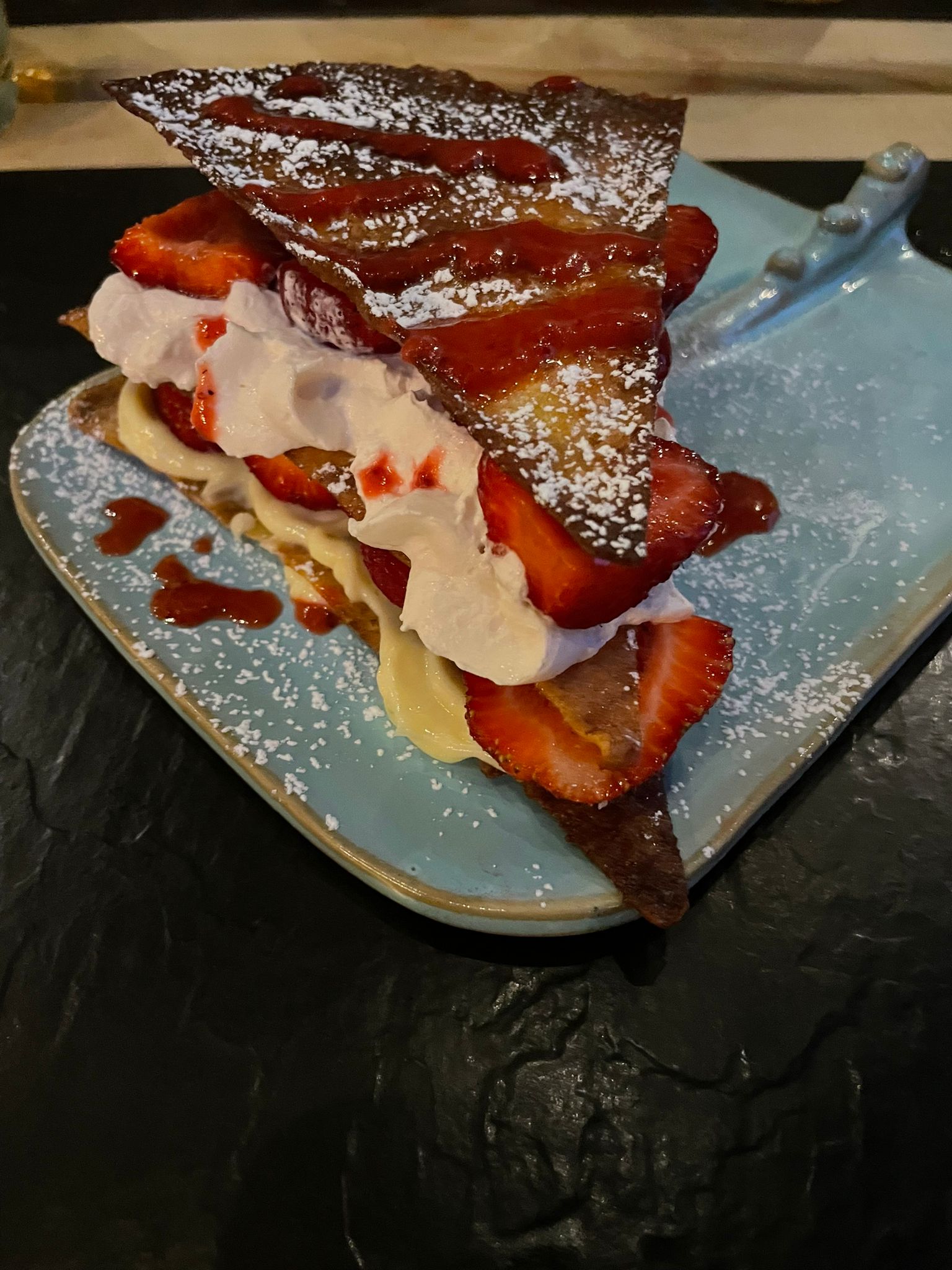Tres cher , peut d'ambiance ,et repas loin detre exceptionnel, tres peut de choix , pizza pate tres fine et bourrée de fromage pour épaissir celle ci 17 euro une pizza de cette qualité a ce prix c'est vraiment abusé . 8 euros pour un ( mille feuille a la fraise fait d'une crepe , de chantilly , et un peut de fraise faut vraiment en vouloir aucun menu enfant de proposé en gros tu doit lui prendre une grande pizza alor qu'il ne la mangera pas autrement l'enfant ne mange pas . Extremement deçu je n'y retournerais pas . si vous avez des sous a perdre allez y il