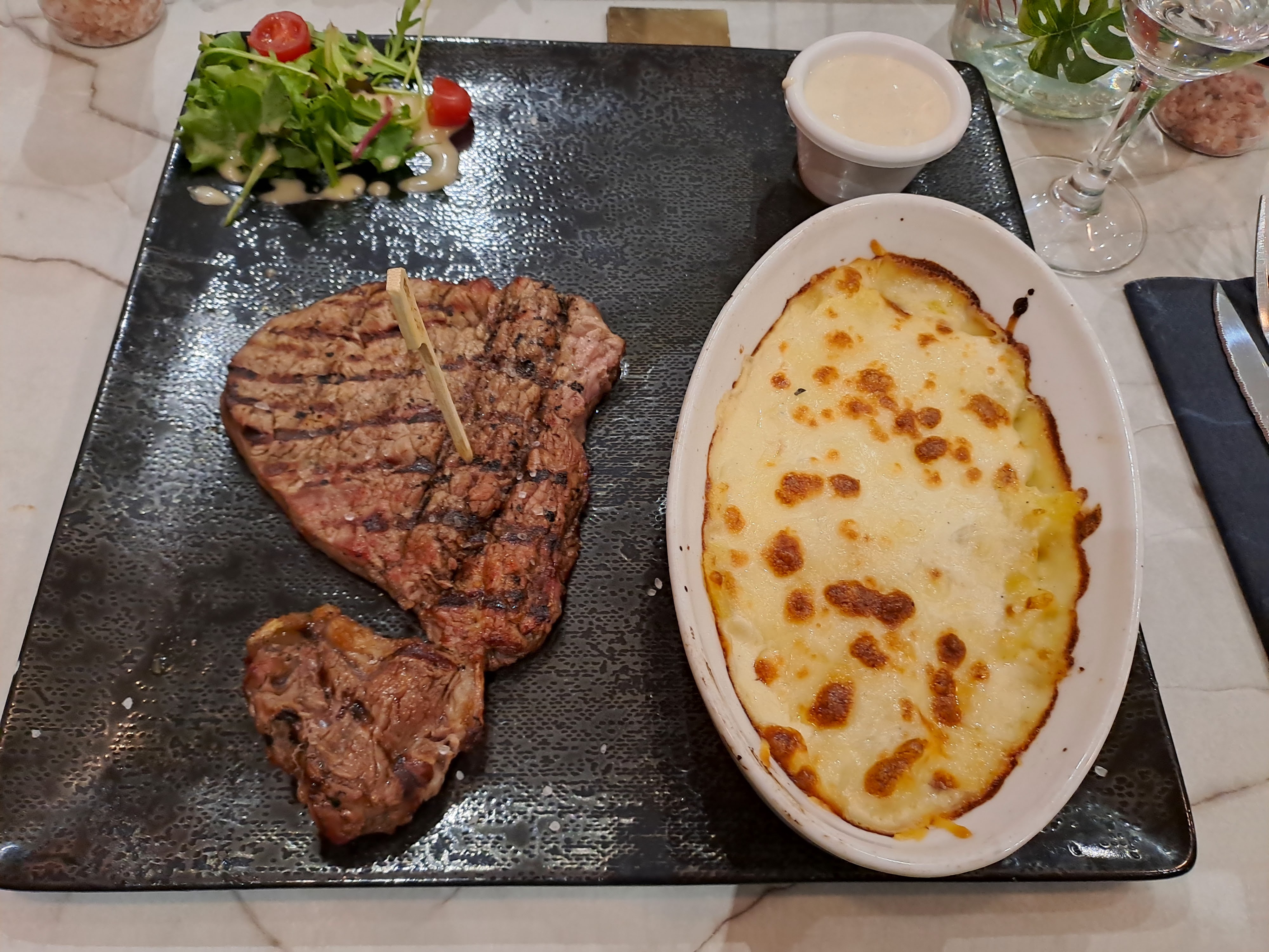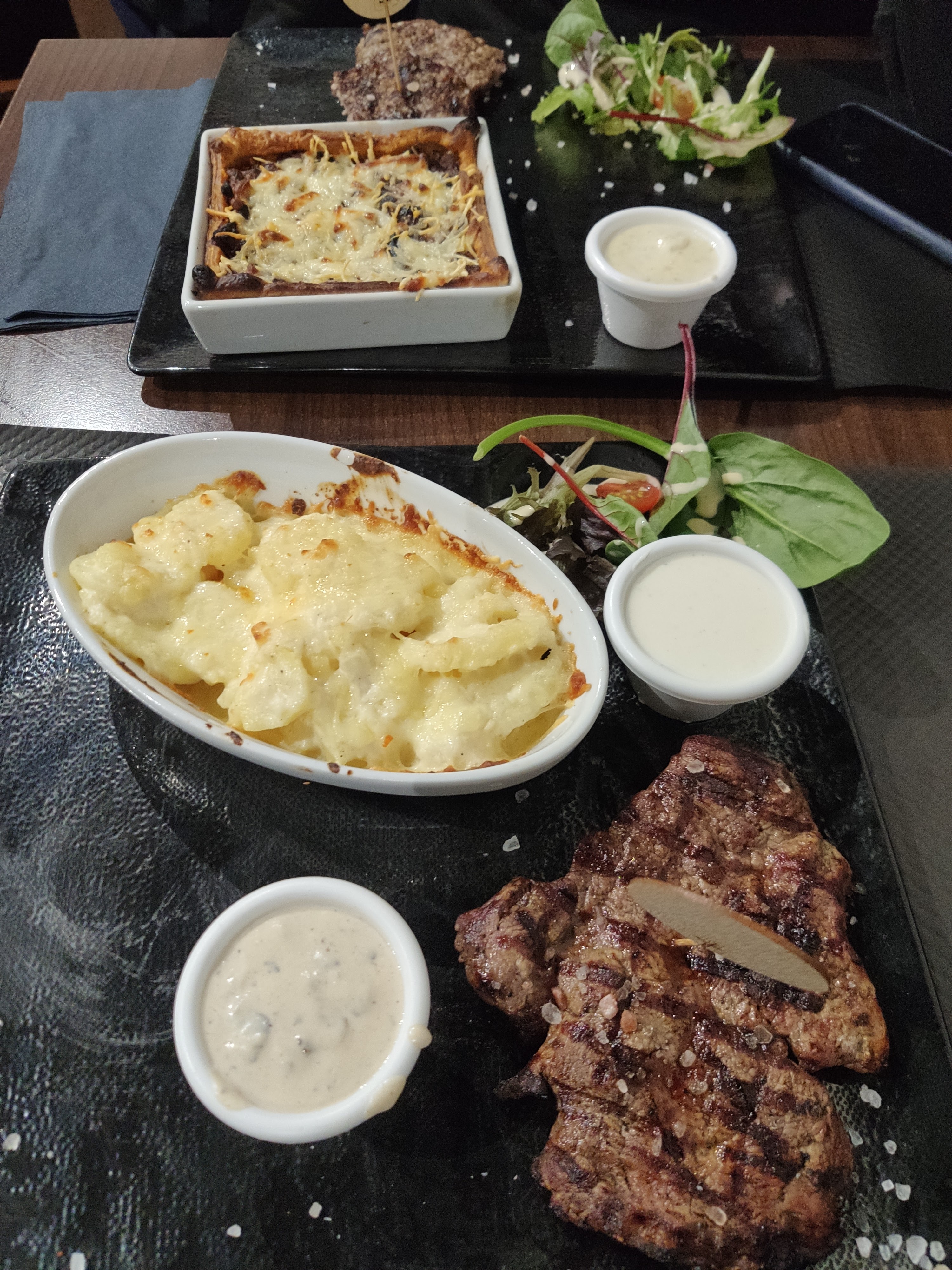 Accueil top! Bon restaurant, j’ai pris une entrecôte elle était délicieuse malheureusement la grillade mixte bof bof certaines viandes étaient cramées…. Et nous n’avons eu qu’une mini portion de salade mais le gratin super bon.