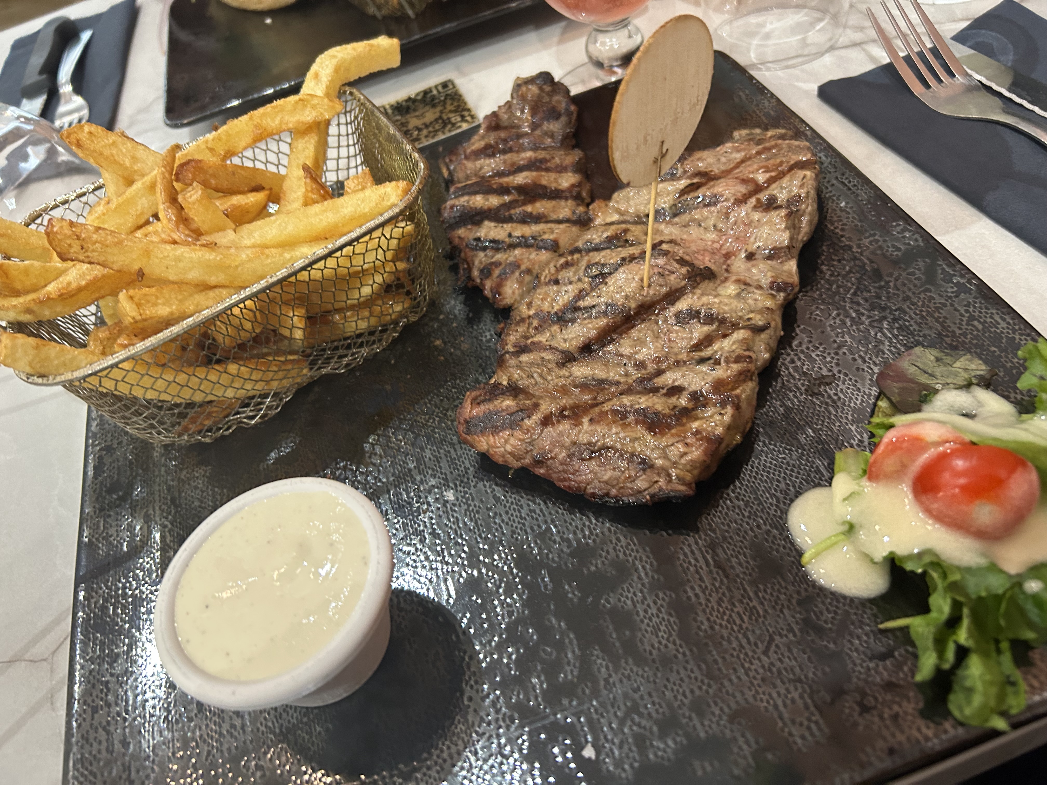 C'était bon mais quantités très réduite pour 30 euros , j'ai eu très peu de frite , petite tranche de viande et très très peu de salade .. je suis sortie j'avais encore faim .. c exorbitant
