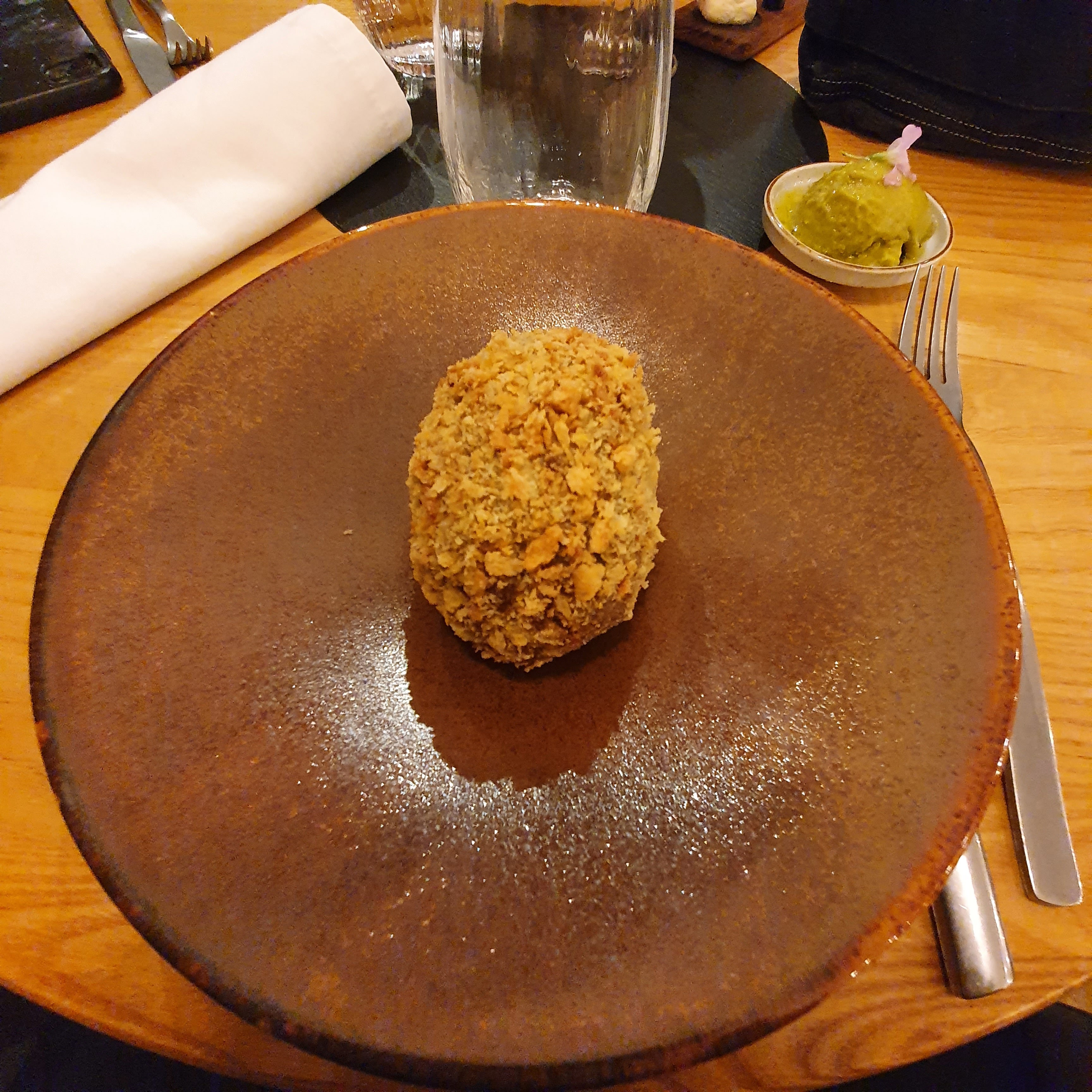 Très belle découverte. Service et lieu agréable. Les personnel sont très sympathiques. J’ai eu un vrai coup de cœur pour le scotch egg au chorizo. L’œuf était cuit à la perfection, coulant comme il faut. Les plats étaient également délicieux. Par contre, le baklava au Brie de Melun était trop sucré à mon goût. Mais dans l’ensemble, c’était vraiment très bons.