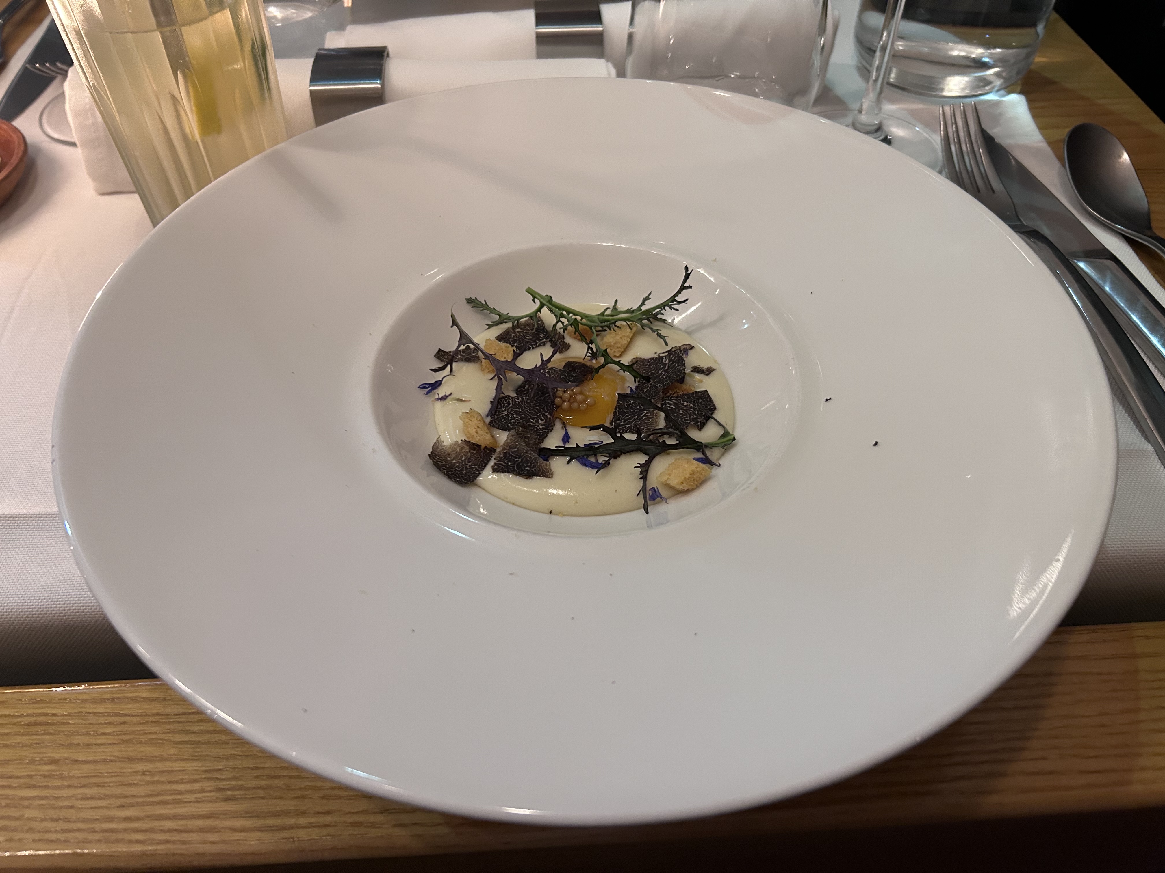 Moment délicieux tant sur le plan culinaire où l'œuf parfait n'a jamais autant bien porté son nom que sur le plan du service où j'ai eu le plaisir de manger sur les chaises hautes face au cuisinier qui nous expliquait sa cuisine Tout le personne porte des gilets comme de vrais serveurs parisiens. Un plaisir pour les yeux et pour les papilles Je le recommande vivement
