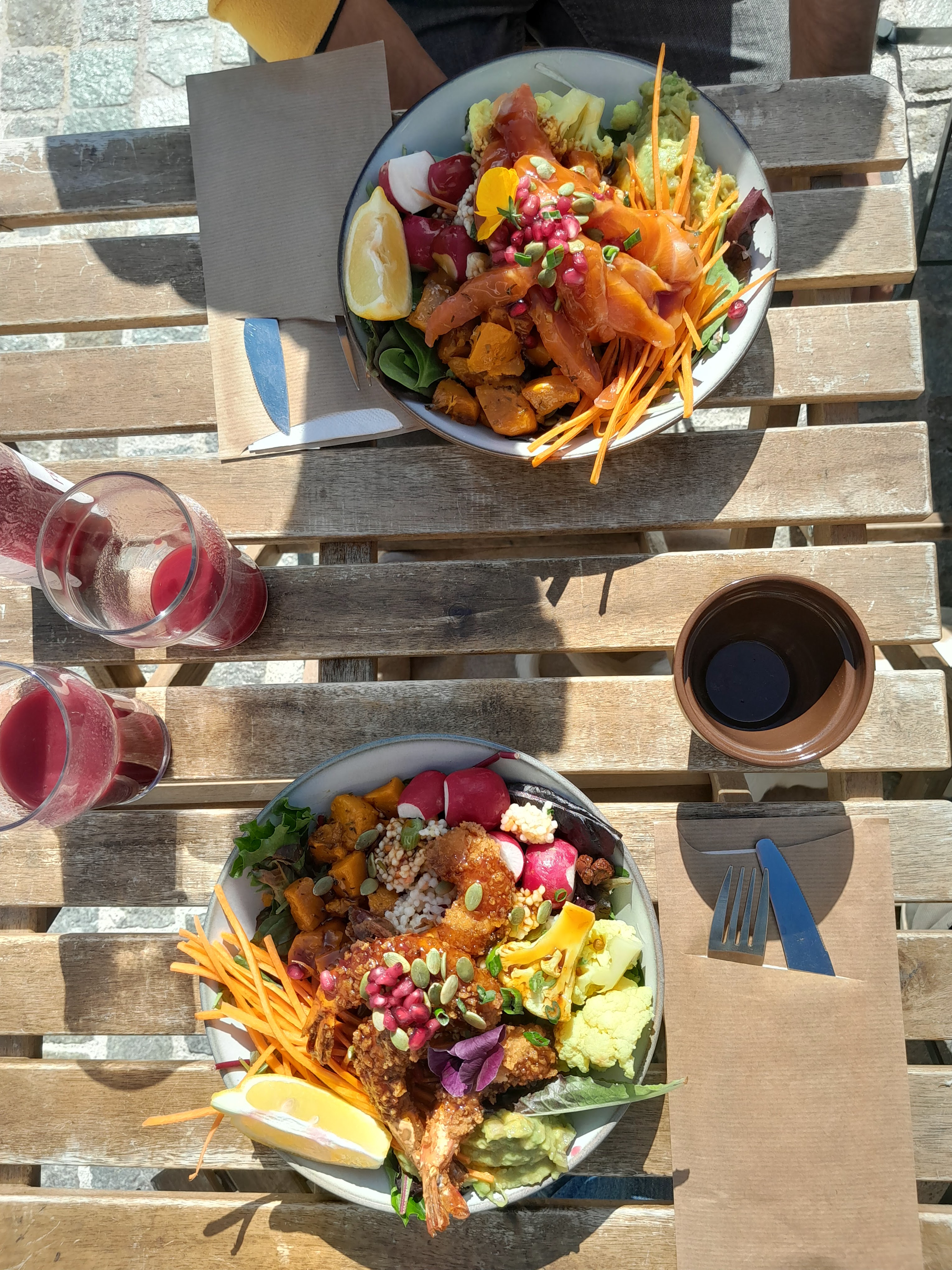Je prenais surtout à emporter. Excellentes matières premières mais un peu trop chargé pour moi. La passion et l’attention sont la. Le cadre en revanche ne me plaît pas du tout. La terrasse est au milieu d’une résidence bon marché bétonnée et collée à un parking. L’intérieur est mignon. J’ai cru à une chaîne vu la similitude avec le même concept existant à Valbonne. À faire pour les plats les plus simples mais pas pour le cadre.