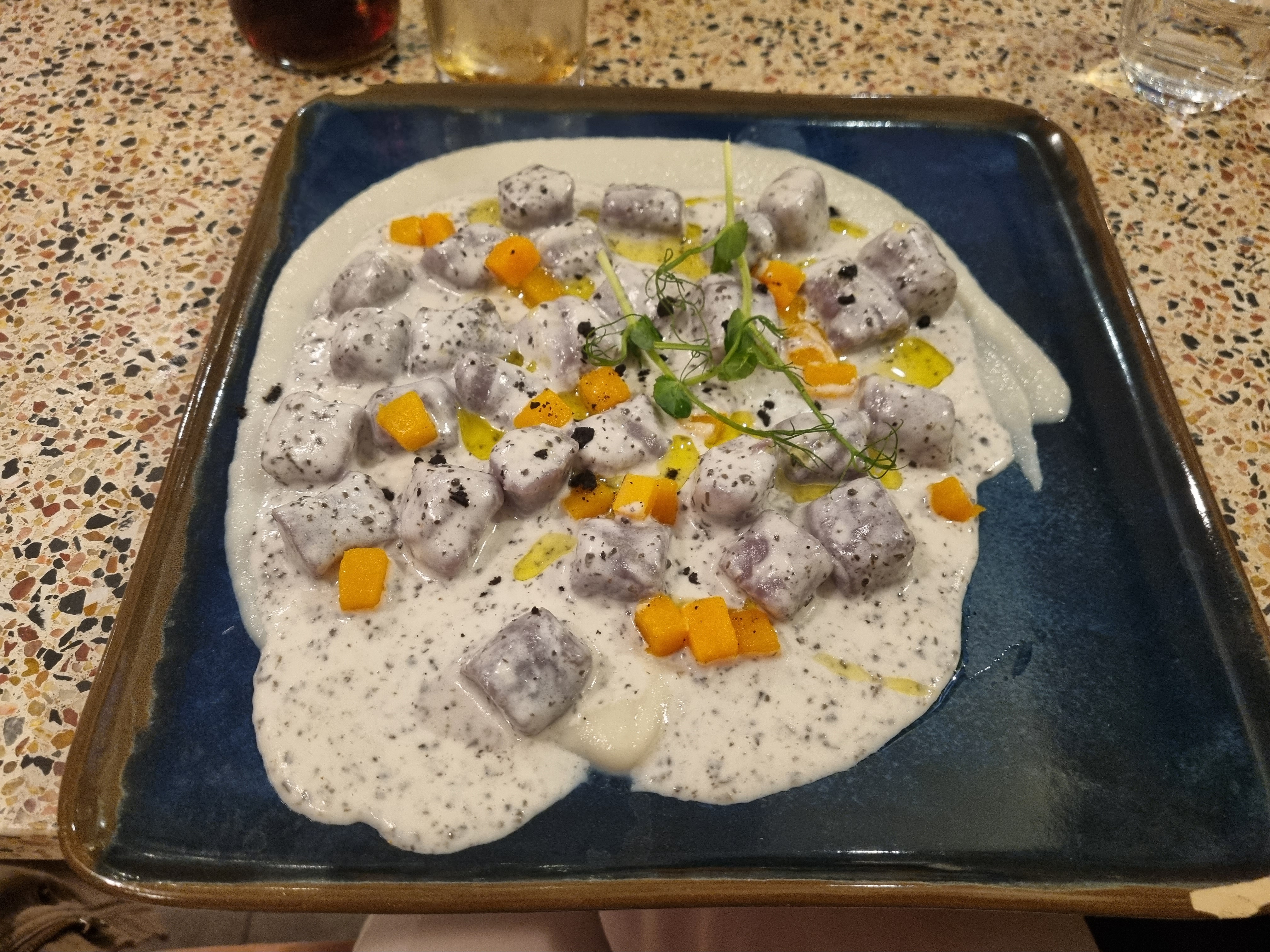 Incroyables produits faits maison. Les gnocchis farcies à la truffe, et l'aranfini était délicieux.