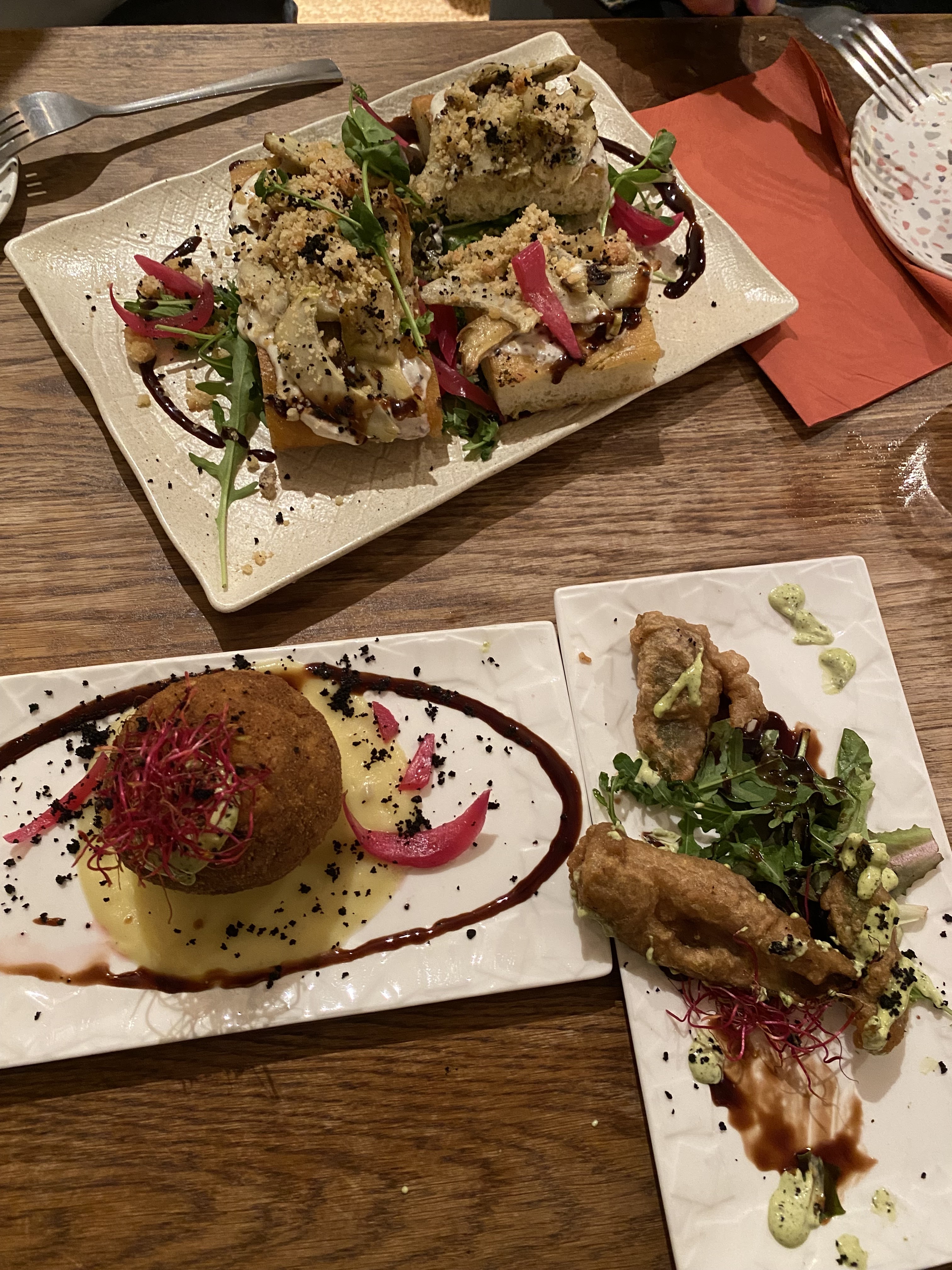 Tout est délicieux!! Une belle carte avec du choix, pour un dîner complet ou pour des plats à partager, service rapide, belle carte de vins et des cocktails quali. Atmosphère agréable, déco canon! J'adore la vaisselle, le choix du mobilier, ry toutes la déco. Personnel sympathique.