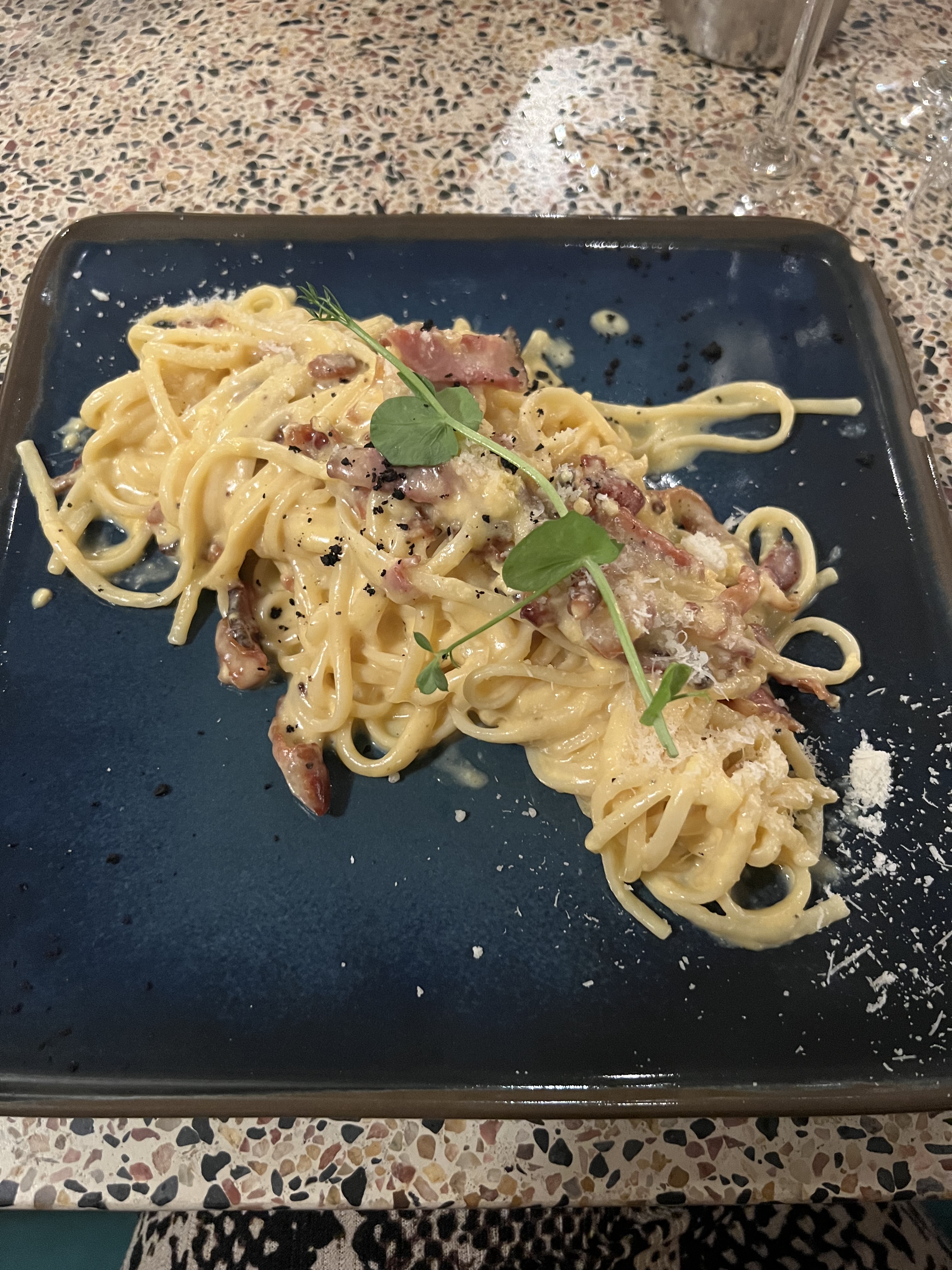 Je veux bien tout entendre, mais un plat de carbonara sans crème, sans lardon et sans kiff, et à 20€… c’est inmangeable. Je ne recommande absolument pas