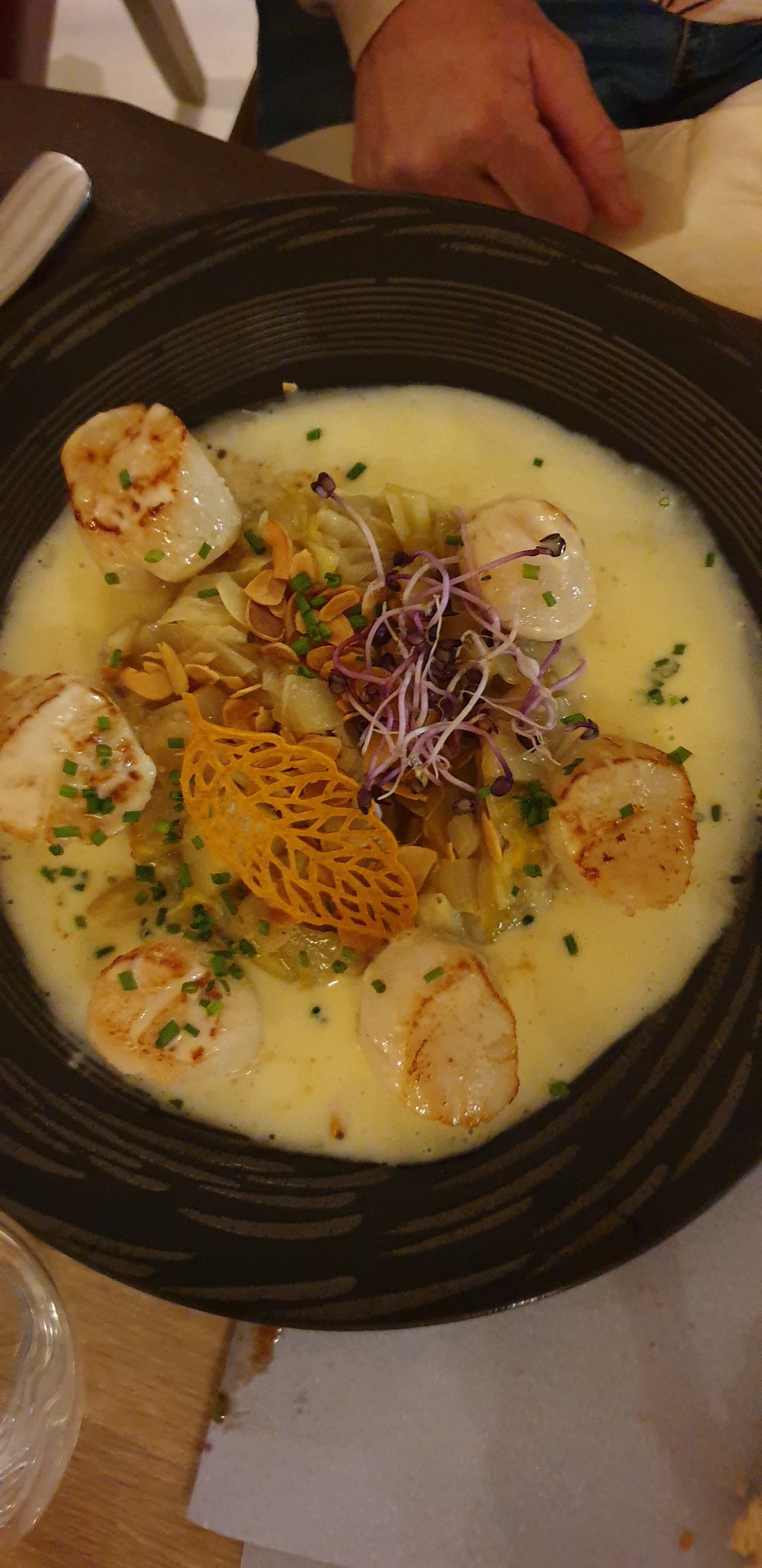 EXCELLENT ! Tout d'abord je tire mon chapeau à l'équipe de serveur(ses) qui sont aux petits soins pour les clients , ce qui devient malheureusement trop rare dans la plupart des restaurants. ( ...Madame, Monsieur...on remplit les verres avant qu'ils ne soient vides, ..on vous apporte du pain avant que vous n'en n'ayez plus, de l'eau, etc...) des gestes de bon sens mais qui font du bien! Ensuite , pour ce qui concerne le repas en lui même : Un véritable feu d'artifice ! une explosion pour les papilles , bref un régal ! ( Noix de saint jacques et profiteroles à tomber par terre.)...Continuez !