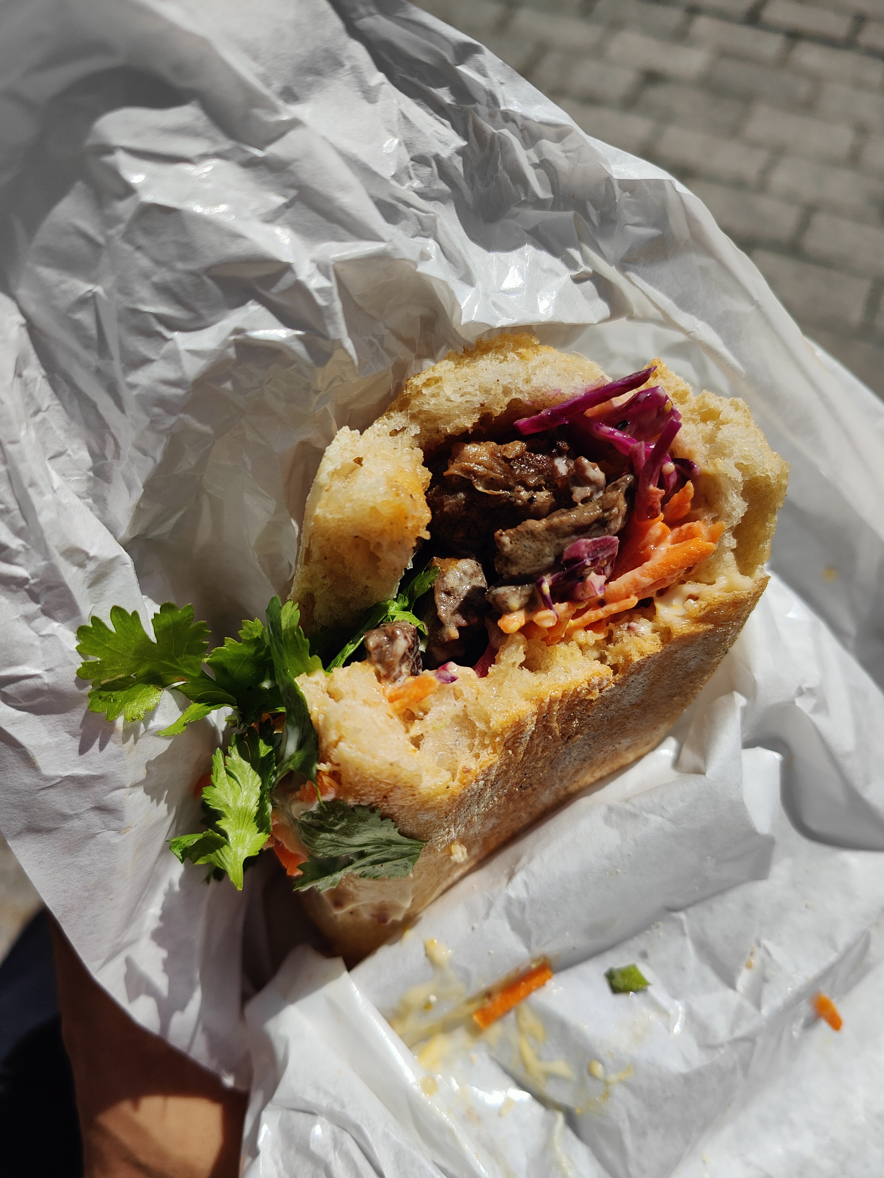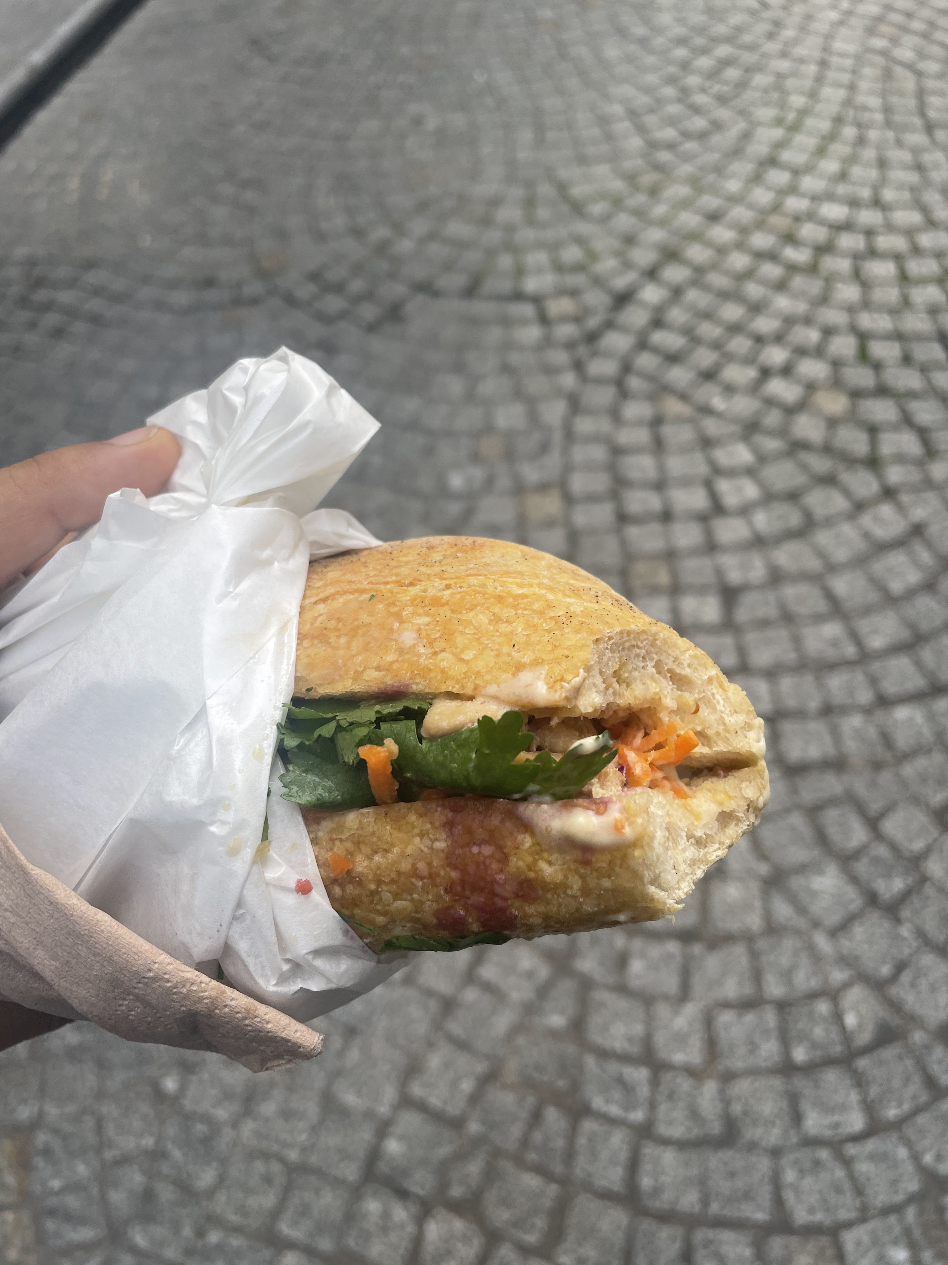 Clairement le meilleur BanhMi que j’ai manger pour l’instant… Le choix du pain qui est un pain Kayser fait la grande différence, l’assaisonnement niquel pour ma part j’avais pris celui au poulet avec du piment (quasi pas perceptible) un régal ! J’en ai fait qu’une bouchée… 🥹