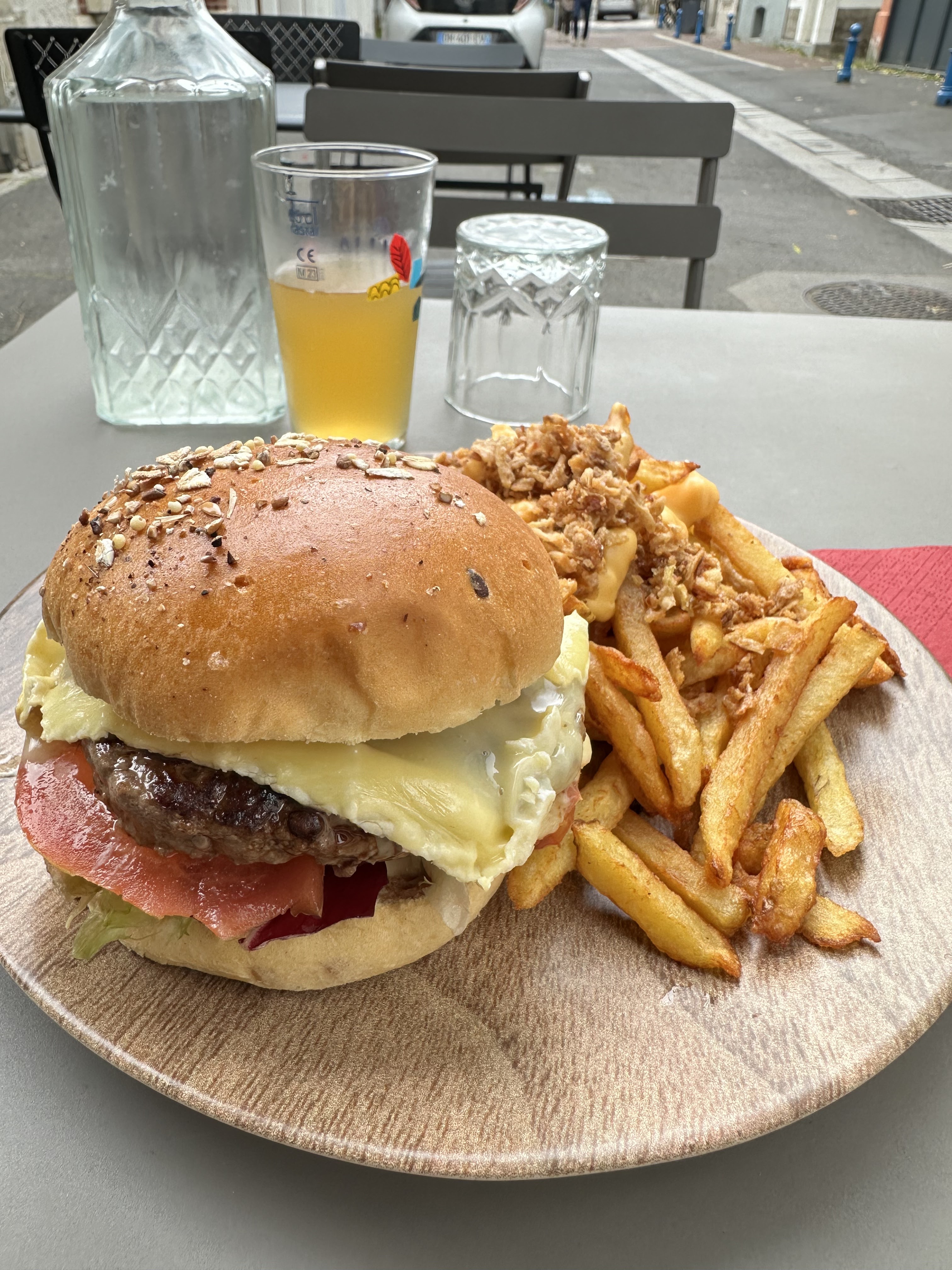 Super cuisine, super ambiance. Merci pour ce bon burger Normand et ces frites maison recouvert de cheddar et oignon frit😋