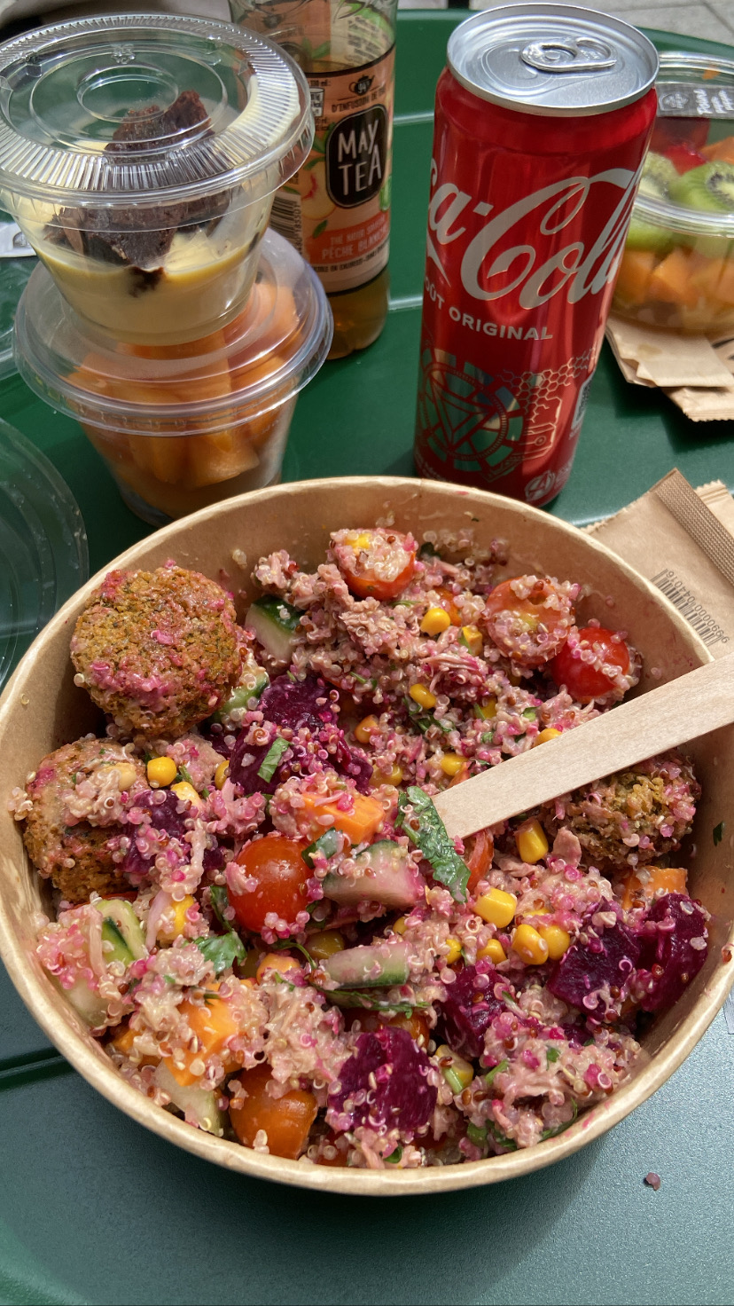 Les salades sont bien fournis et plutôt bonne. Gros + : le fait de pouvoir commander via l'application et de venir chercher la commande. Ça évite la grande file d'attente du midi 😉