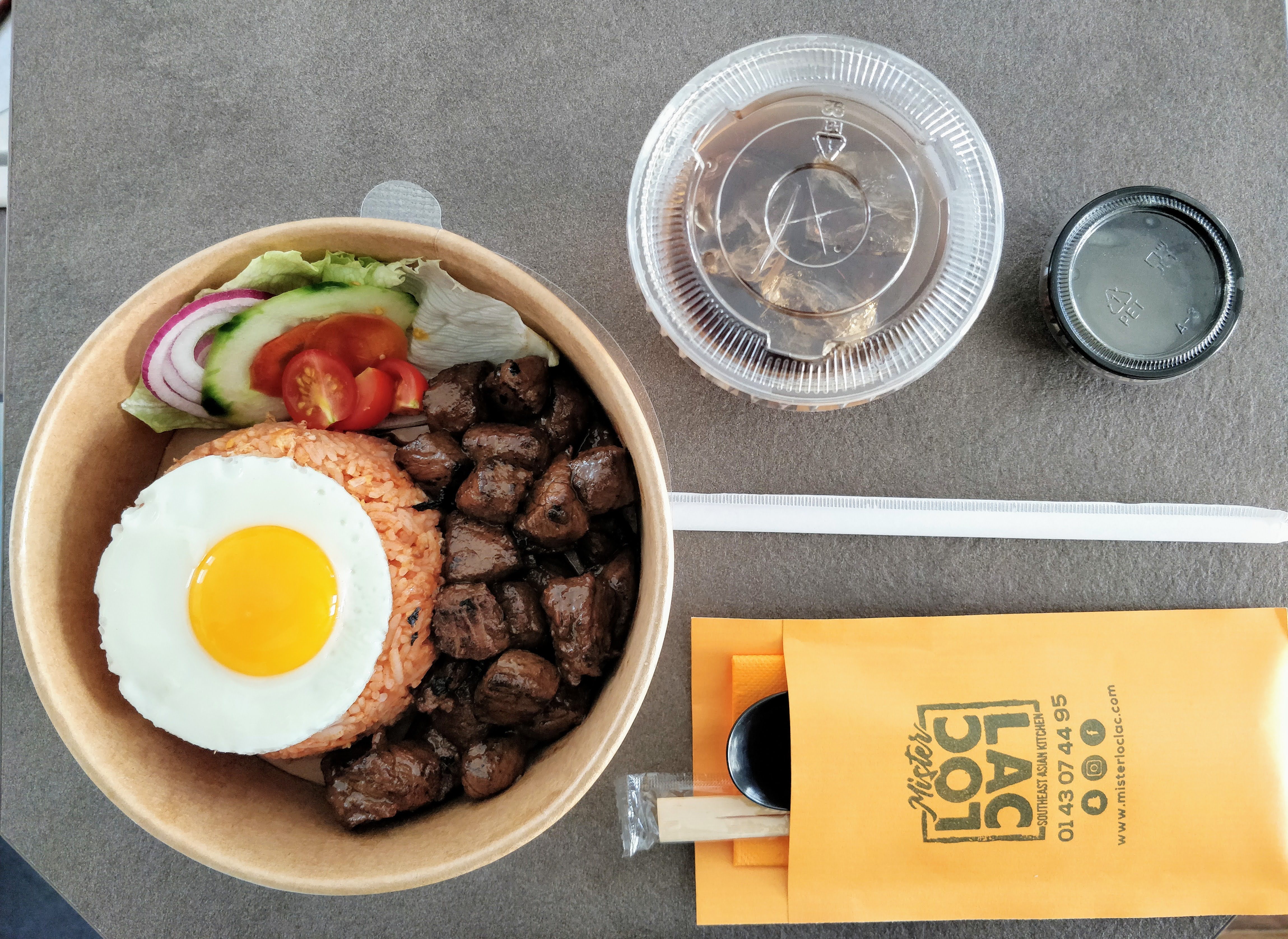 Un bon Loc Lac, la viande est top, le riz rouge est bon mais ça serait top d'avoir des rondelles fines de concombre / tomate / oignon blanc (Et retirer les carottes), c'est un détail mais ça ferait la différence 😁