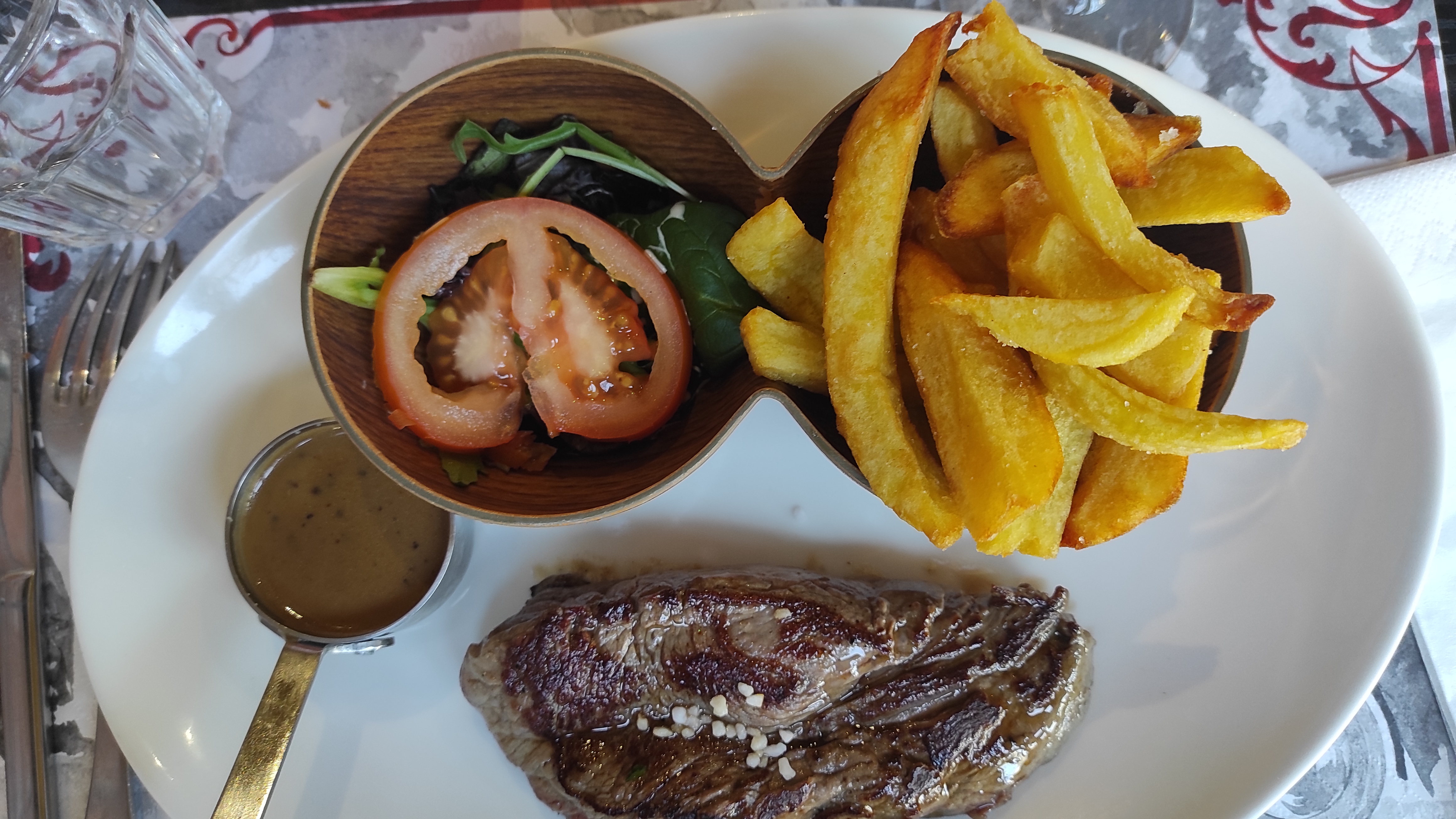Bel endroit pour partager des moments conviviaux, en terrasse ou à l'intérieur 🥰 Je vous conseil la pièce du boucher accompagnée d'haricot verts. Viande tendre et haricots croquants, un délice 😉 Petit bémol, je demande une viande à point, déçu de l'a manger saignante. Je vous déconseille le tiramisu, qui baigne dans le café. Je vous conseille la tarte tatin, un délice, mais trop sucré ! Merci pour le service et la réactivité professionnelle de la serveuse 🥰