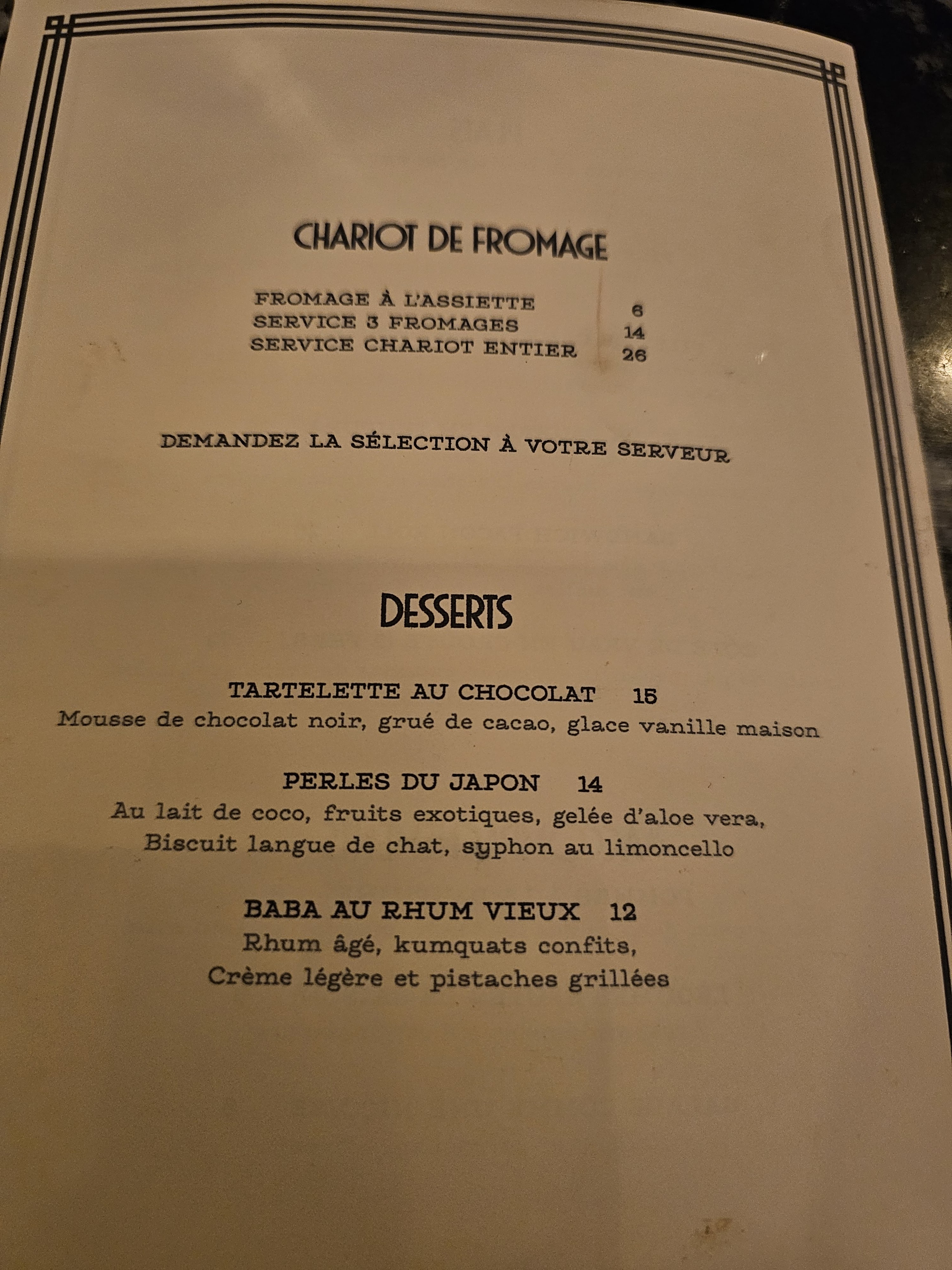 Lieu hyper agréable, le personnel est charmant et aux petits soins , Les cocktails très originaux préparés devant nous ….de très bons vins pour accompagner un chariot de fromage, de grande qualité avec ses noisettes ,figues, et abricots secs excellent!!!!