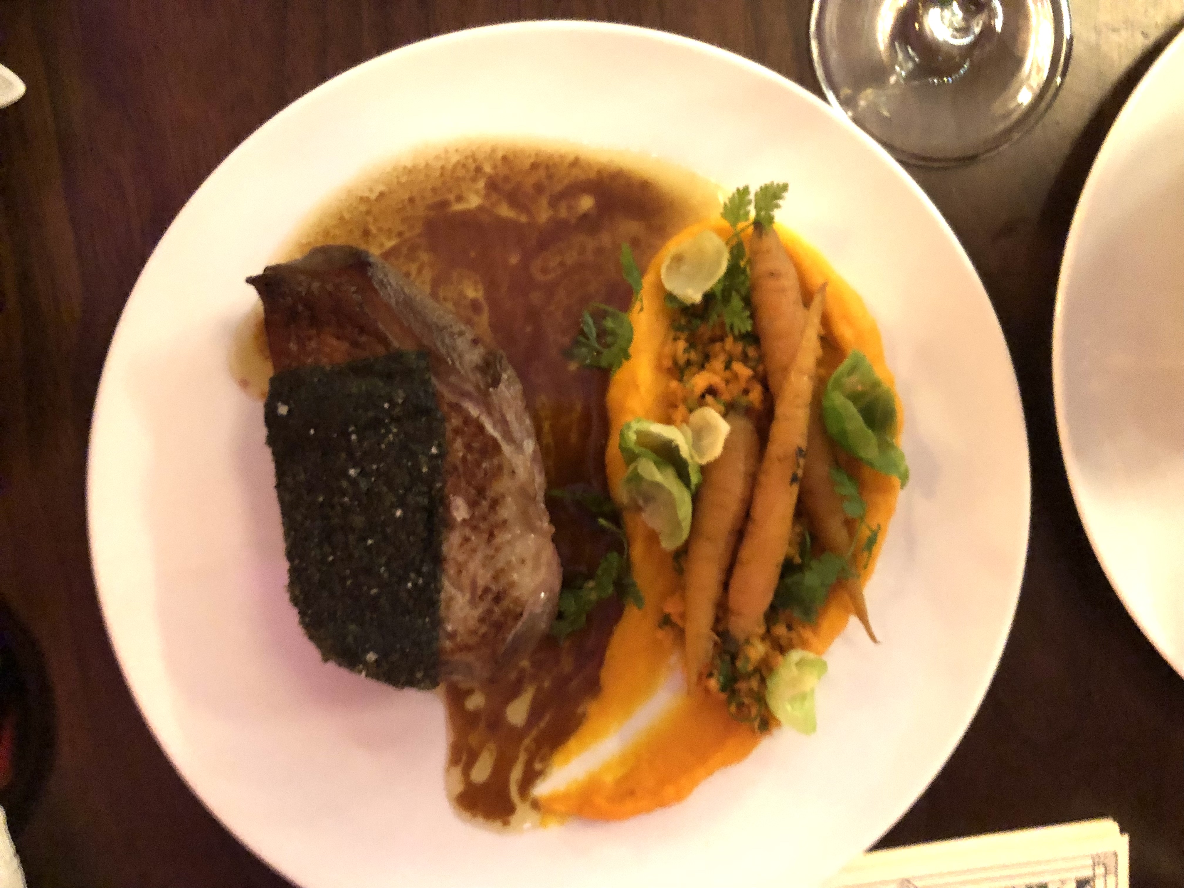 Quelle joie inattendue ! Je cherchais un restaurant où aller lors d'un voyage de travail et je l'ai trouvé près de mon hôtel. Le restaurant est situé à l'étage d'une salle de spectacle, donc c'était un peu inhabituel d'y accéder. Mais dès votre arrivée, il est clair que vous avez eu de la chance ! L'espace est magnifique, décoré de manière colorée et chaleureusement éclairé en même temps. La nourriture était délicieuse et magnifique à regarder. Je ne suis pas un amateur de purée de pommes de terre, mais j'y ai eu la meilleure mousseline de purée de pomme de terre de ma vie. Personnel extrêmement sympathique et sympathique, tout en restant assez efficace. Alors que j'étais sur le point de payer, le serveur m'a dit Je suis content d'apporter ton chèque, mais il y aura un spectacle d'acrobate dans 3 minutes donc ça vaut le coup de rester. Je l'ai fait. Les lumières se sont éteintes et cet acrobate est venu et a fait une routine de danse acro, suspendue au plafond, à 10 pieds devant ma table (placement chanceux !). Ce fut un moment fort de mon voyage et presque entièrement accidentel.