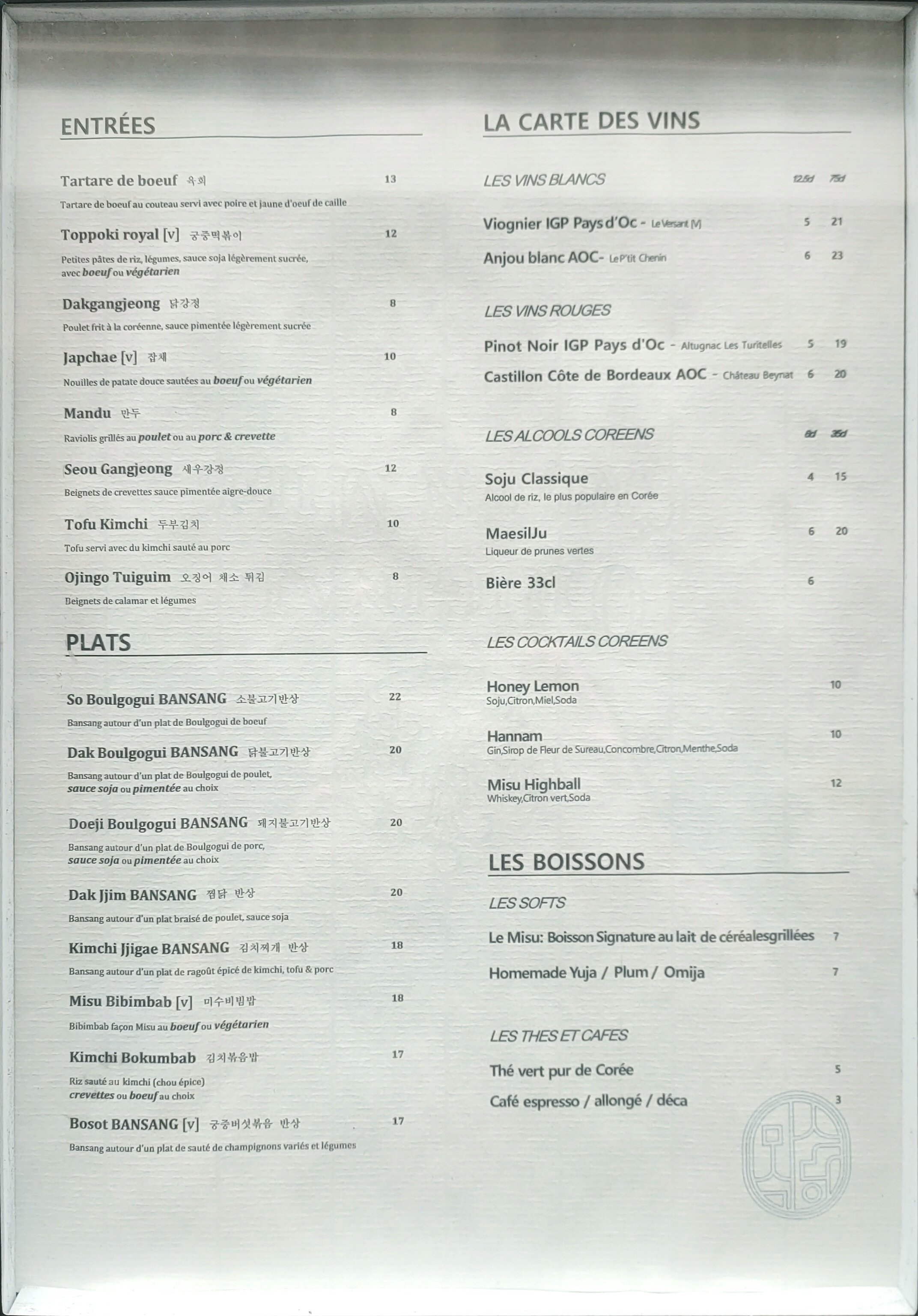 C’est très rare que je commente mais là je me devais de le faire. J’ai récemment dîné à ce restaurant avec mon épouse pour une occasion particulière. Nous habitons dans le coin et passons souvent devant ce restaurant qui vient d’ouvrir ses portes. Nous cherchions un lieu calme avec pas trop de monde et ça correspondait exactement à nos attentes. Le repas s’est très bien déroulé, la serveuse est souriante et attentive à nos besoins, dommage qu’on ne peut en dire autant pour la personne derrière le comptoir qui est plus froide et distante. Nous avions tous les deux commandé un tartare de bœuf en entrée, un bœuf boulgougi et un bibimbab en plat. Le boulgougi a un goût redondant, et plus on le mange moins on en a envie. Le bibimbab est très classique, on en retrouve des meilleurs pour presque moitié le prix. Ce qui m’a poussé à écrire ce commentaire est que le lendemain nous avons tous les deux eu tres mal au ventre. La seule chose que nous avons mangé en commun les derniers jours était le tartare de bœuf, que nous avons déjà trouvé pas très frais lorsqu’il avait été servi. Nous personnellement ne reviendrons plus.