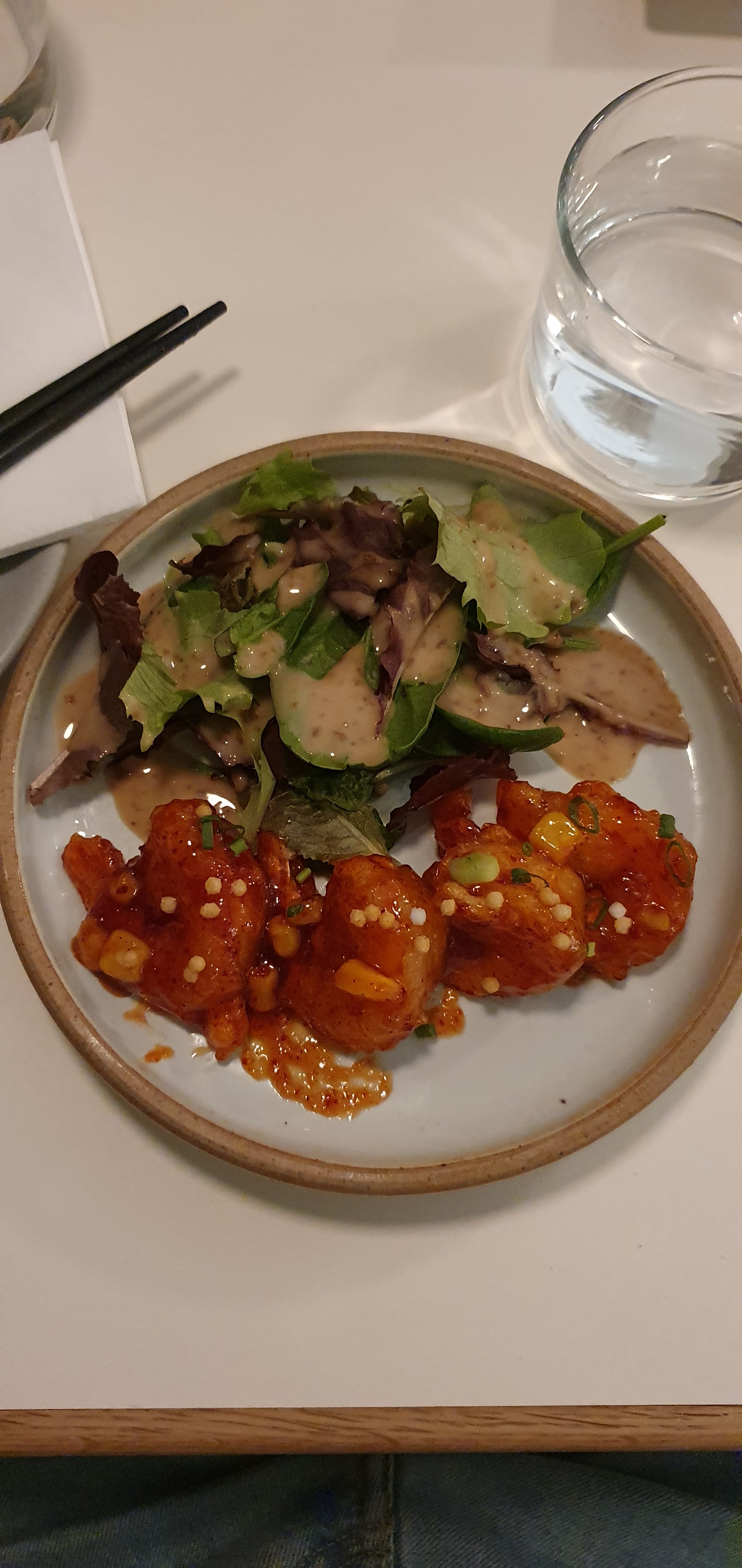 C'était vraiment bon, tous les plats sont accompagnées d'un assortiment d'accompagnement coréen. Ils ont a larte les habituels bibimnap et bulgogi mais aussi des plats qu'on voit moins souvent dans les autres restaurants (+des options végétariennes) Ils proposent même des plats de saison en plus de la carte Le seul bémol, les entrées étaient relativement chères et vraiment petites, prennez plutôt directement les plats.