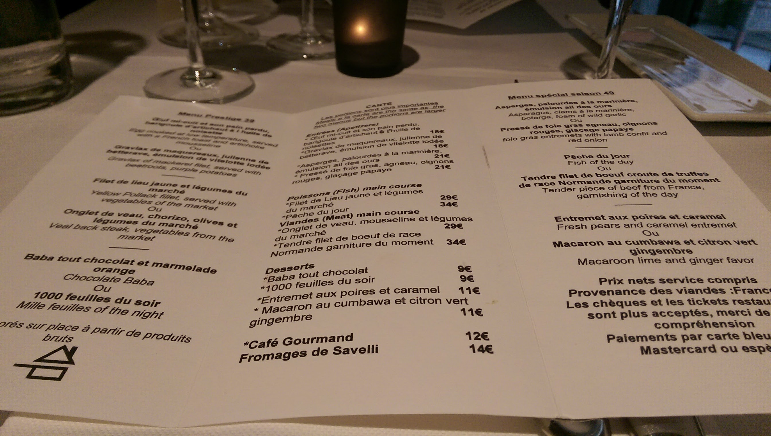 Meilleurs plats (!!!) pendant 10 jours à Paris et en Provence en recherchant tous les meilleurs restaurants. Saveurs : préparation fraîche, créative, talentueuse et toujours excellente, tout est parfait. Prestations : Excellentes *** Quel plaisir de manger ****