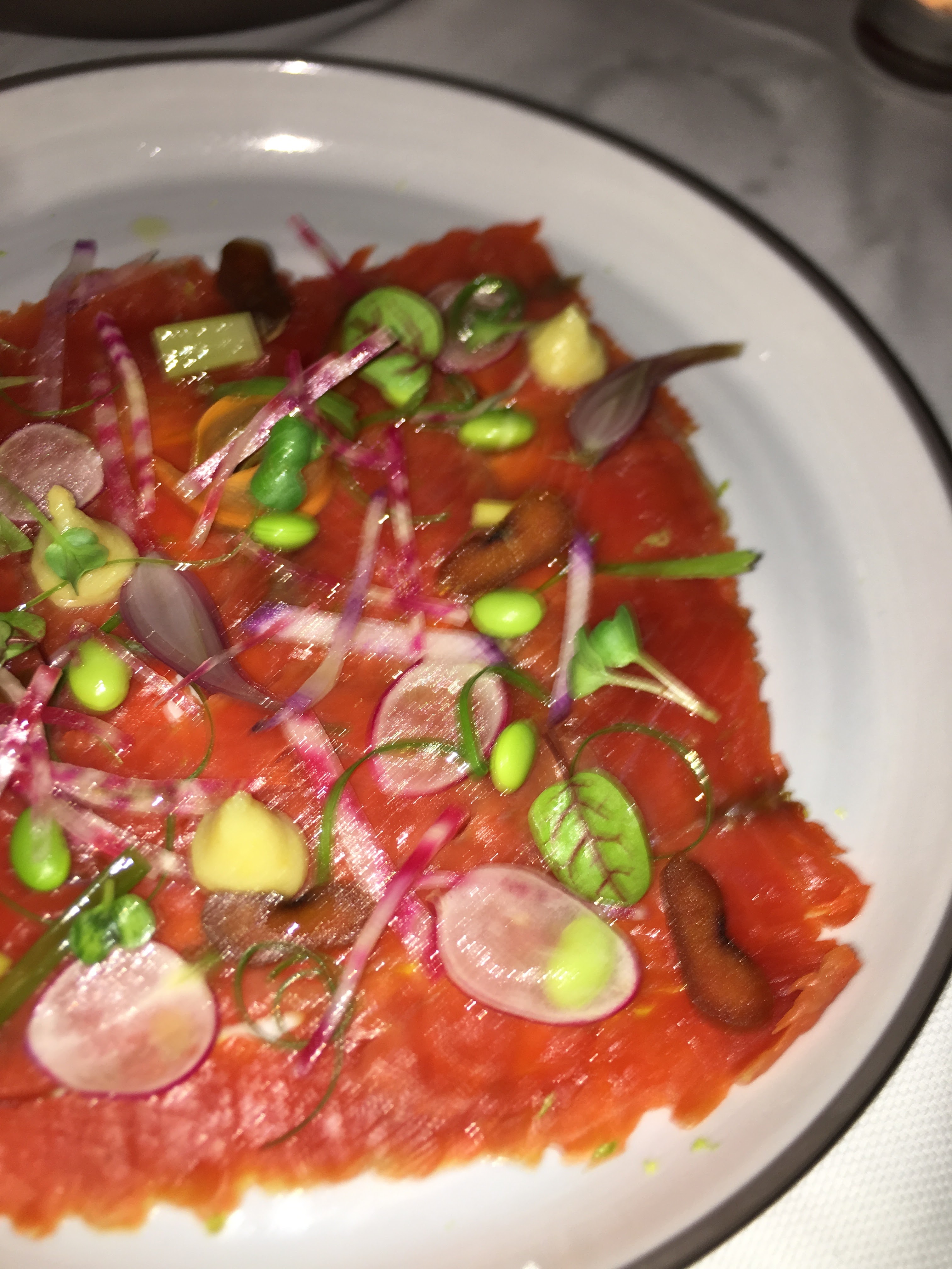 Accueil correct (beaucoup de monde). La salle est simple mais élégante. Mise en bouche délicieuse. Entrée: gravlax de saumon. L'assiette est magnifique. Les goûts sont subtils. Toutefois pas d'effet waouw comme je croyais l'avoir. Mais correct et bon goût. Je pensais être + surprise.