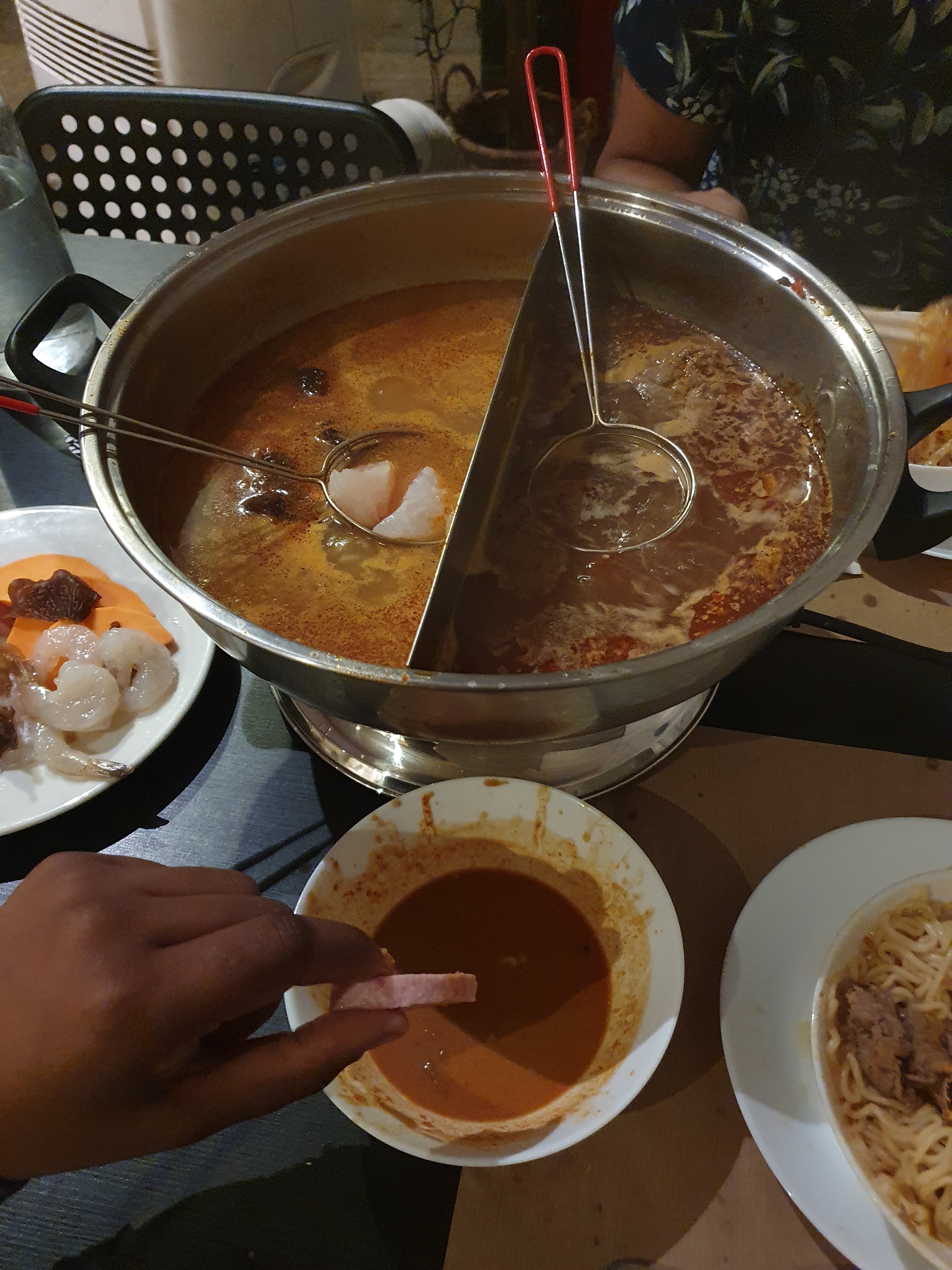 Belle découverte qui m'a rappelé mon voyage en Asie du sud-est. Le monsieur explique très bien comment faire. 2 bouillons au choix. Les proportions sont importantes (et illimitées). Nous n'avons pas fini le 1er plateau de viande mais avons demandé plusieurs fois des légumes, crevettes etc...C'était délicieux. Par contre la salle et les table sont un peu petites et la salle est un peu vieillissante. Ce sera mon restaurant de fondue asiatique désormais, hâte d'y retourner.