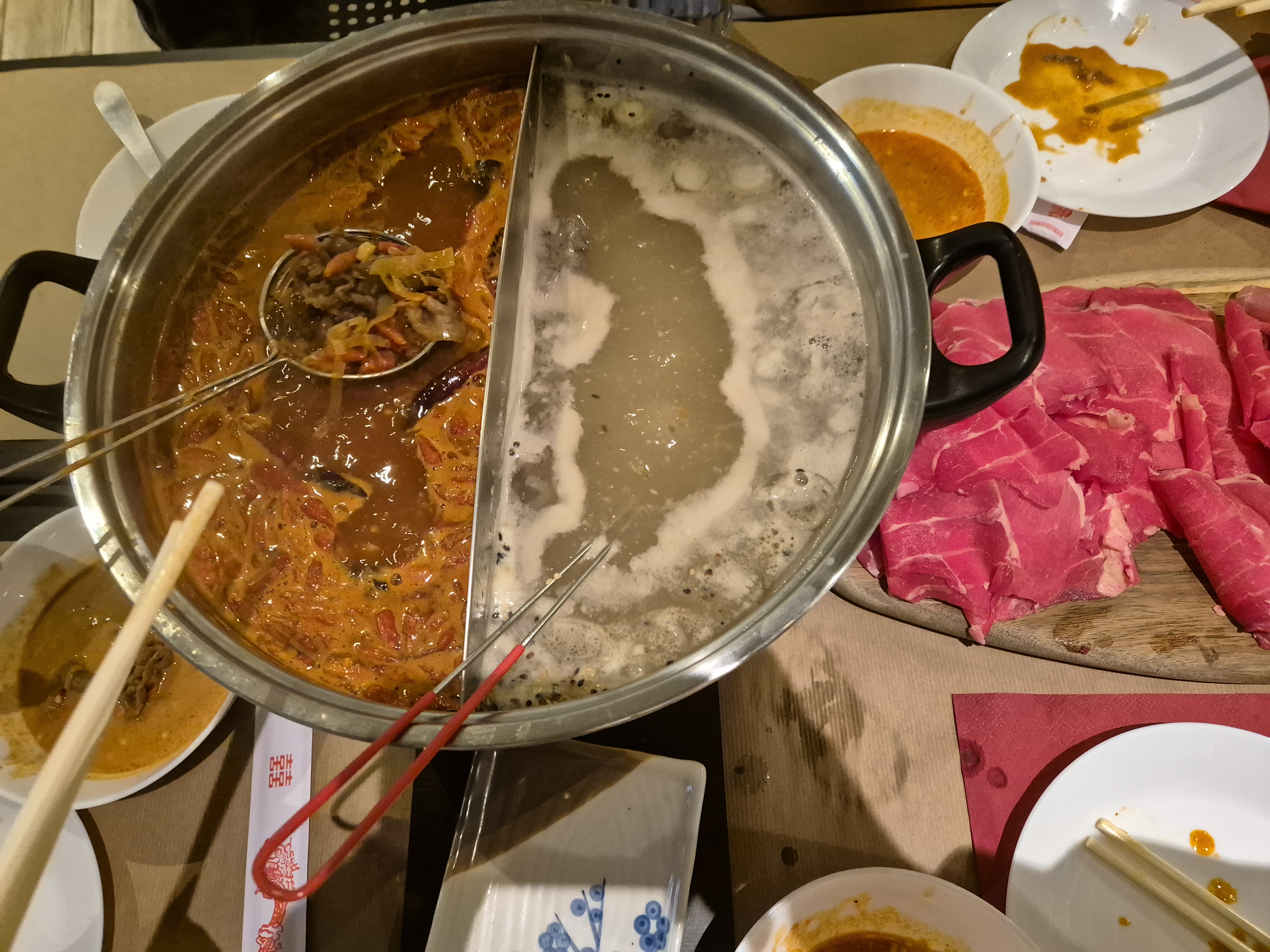 Super première expérience de la fondue traditionnelle chinoise. À réitérer dès que possible, le personnel est très accueillant et sait mettre l'ambiance. Mais assez parlé du cadre qui est juste génial et parlons plus de ce qui nous intéresse ... la nourriture ! Je peux vous garantir que les mets proposés sont typique en chine pour la plus grande majorité. Vous avez la possibilité de manger végétarien si vous le souhaitez. Pour ma part cela a été fondu piment niveau 3 et thaï et je dois vous dire attention à vous le niveau 3/4 est déjà pas mal épicé, pour ma part je testerais le niveau 4 lors de mon prochain passage. Je vous recommandes les tranche de viande elles arrivent enroulées et surgelé pour la présentation. Le gout de la viande est bon et la sauce à composer soit même était juste géniale. Le tarif des boissons est intéressant en grand format. Le tarif est de 25€/personnes pour la fondue à volonté ce qui me parait être un bon tarif, au vue de l'expérience vécue. Globalement c'est beau à voir, bon à manger et bien à vivre donc je vous recommande vivement d'essayer une fois et après vous verrez que vous y reviendrez.