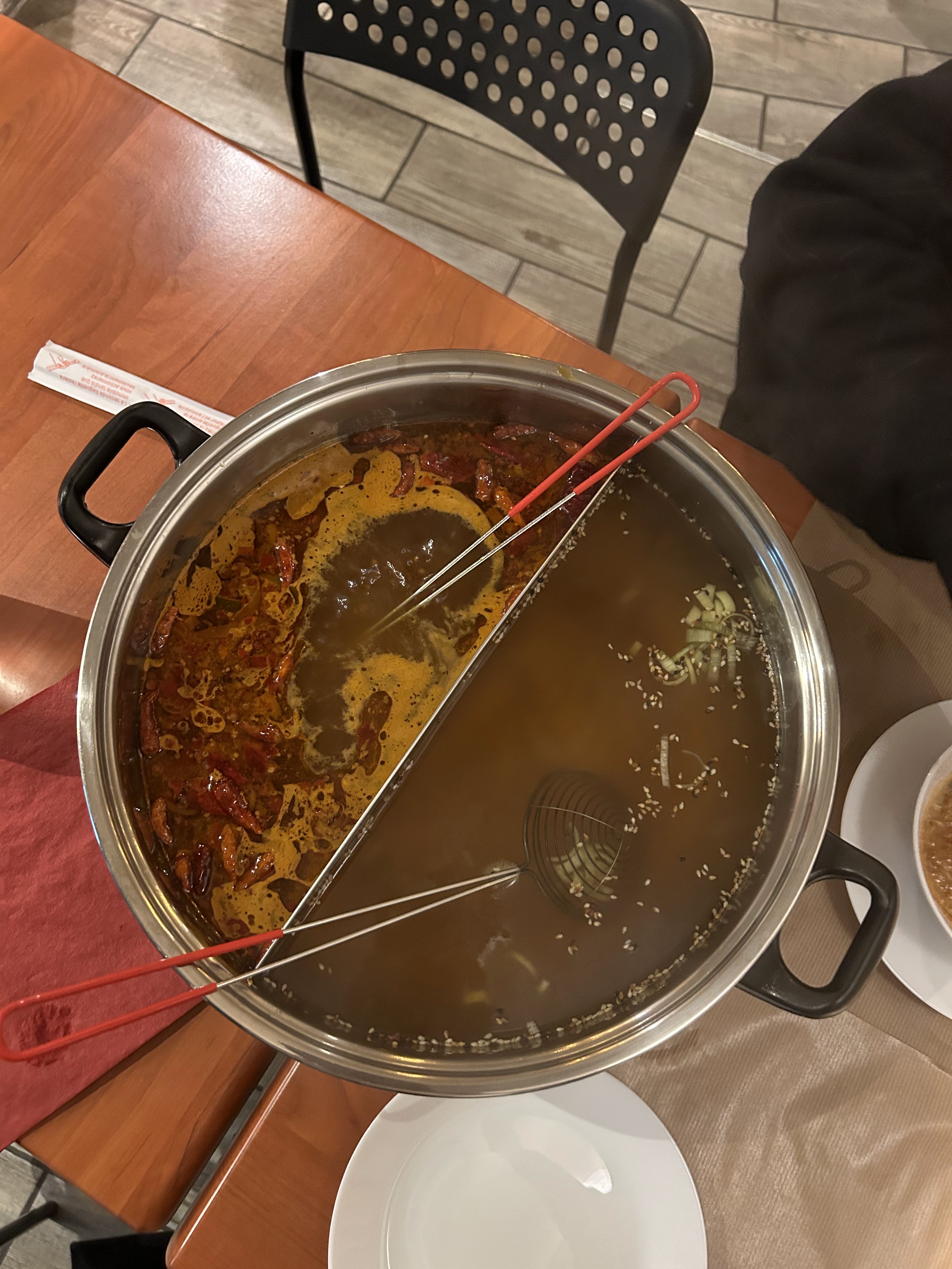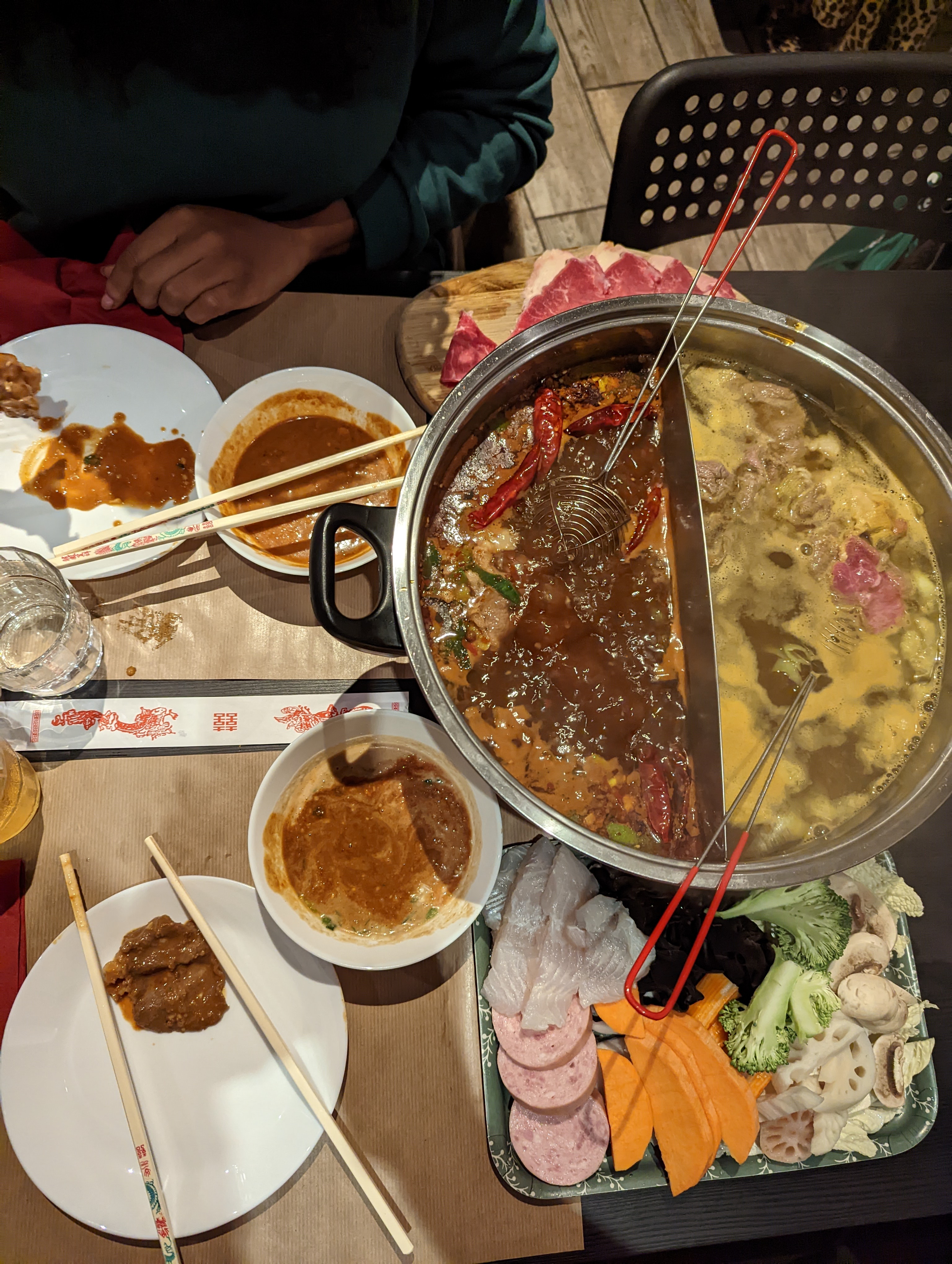 Très convivial, petite salle. La fondue chinoise nécessite d'être un peu habile avec les baguettes (histoire de réussir à pêcher son repas et de ne pas s'en mettre partout) Attention, la soupe pimentée est rapidement trop forte, ne sous estimez pas la puissance des piments.