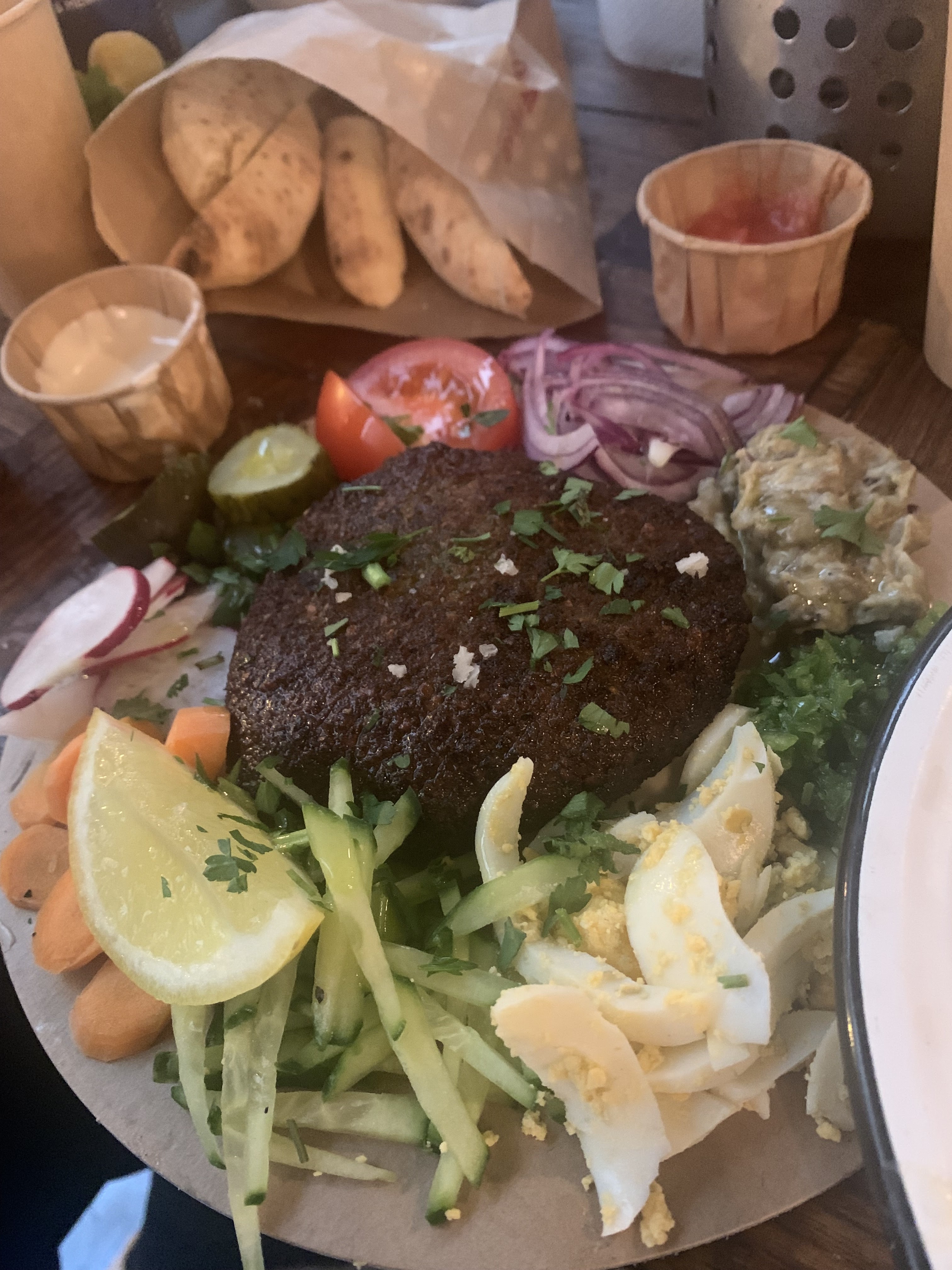C'était génial. La nourriture était absolument délicieuse. Il existe de nombreux plats végétariens et végétaliens parmi lesquels choisir. J’ai mangé le Hamburger et les Falafel Balls, même si je ne suis pas fan de coriandre je les ai adorés. La viande du hamburger était de taille moyenne et très juteuse, elle se mariait bien avec les oignons et la sauce à l'ail incroyablement savoureuse. ( :