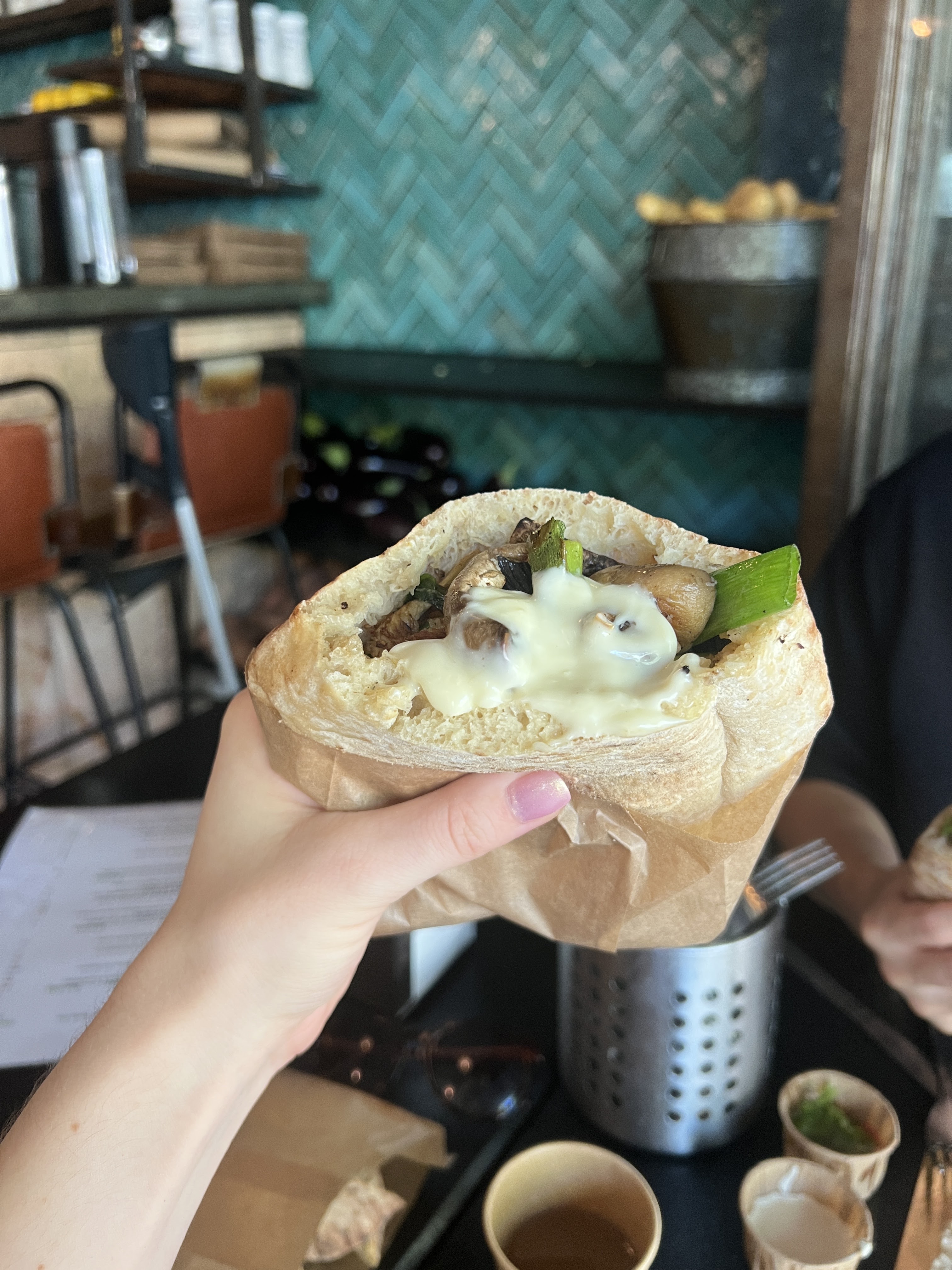 Les deux choses que j'ai mangées étaient décevantes, ce qui est dommage, car la nourriture des autres avait l'air vraiment délicieuse. J'ai eu la salade verte qui était juste trempée dans la vinaigrette, elle était si lourde. Ensuite, le pita aux champignons dégoulinait de sauce aïoli, j'ai dû le gratter et utiliser du pain séparé pour le manger. Aucune autre saveur ou épice intéressante. Sans mentir, j’ai eu mal au ventre le reste de l’après-midi. Je serais prêt à essayer le falafel parce que ça avait l'air délicieux.