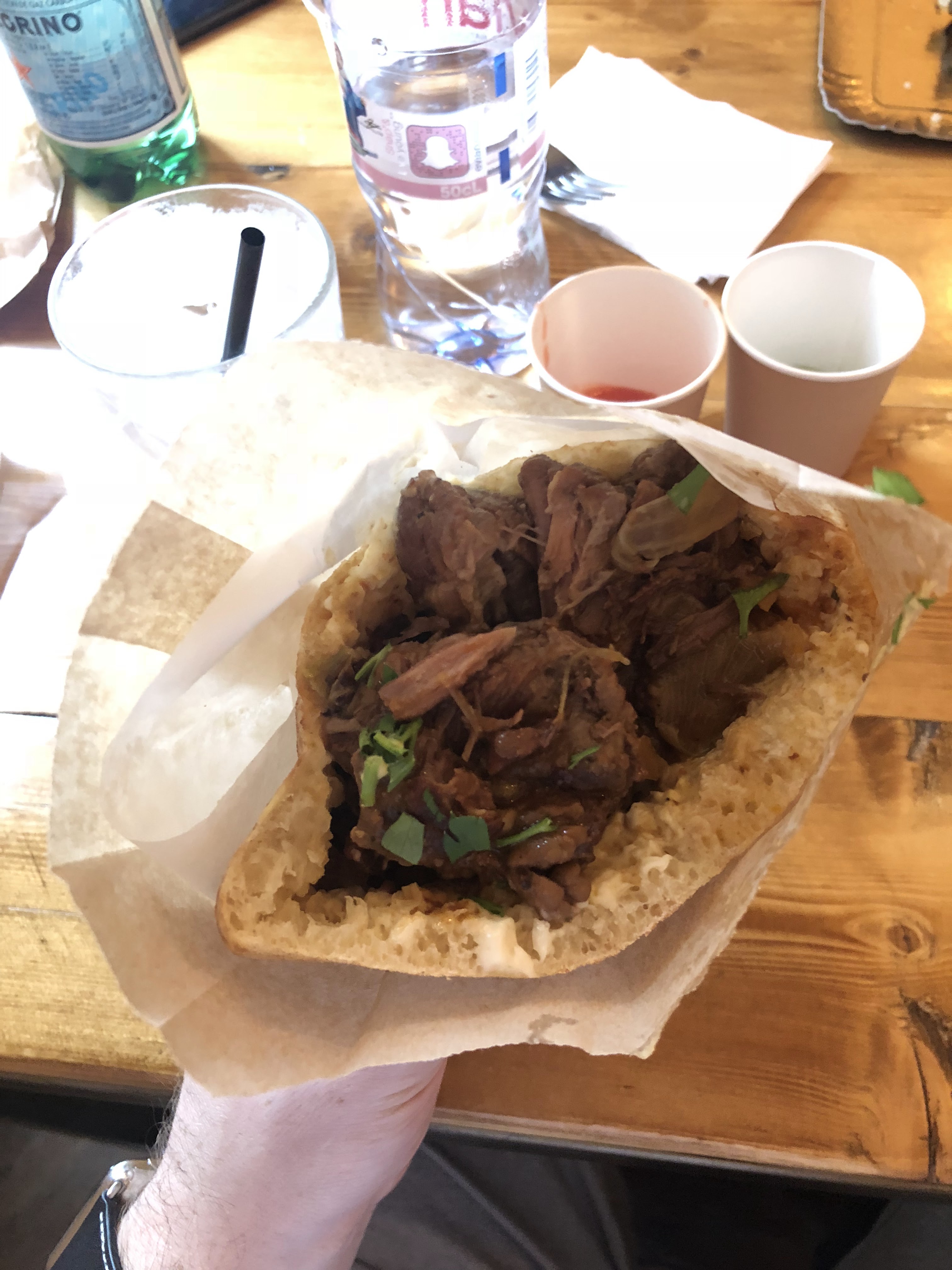 Le pita ratatouille était très savoureux, le problème c'est que j'ai eu mal au ventre toute la nuit le lendemain ! Donc passez votre chemin si vous voulez éviter l'intoxication alimentaire. Cela est sans doute du aux sauces mises à la disposition des clients qui sont dans des petits gobelets à l'air libre, alors qu'il fait 30 degrés à l'ombre... Par ailleurs, pas du tout ecolo les gobelets en plastique pour se servir de l'eau... À 300 clients par jour, ça fait 300 gobelets de déchet jetés chaque jour....je vous laisse faire le calcul sur un mois. Et apparemment en 2018 le système de gobelet existait déjà. Donc je décommande !