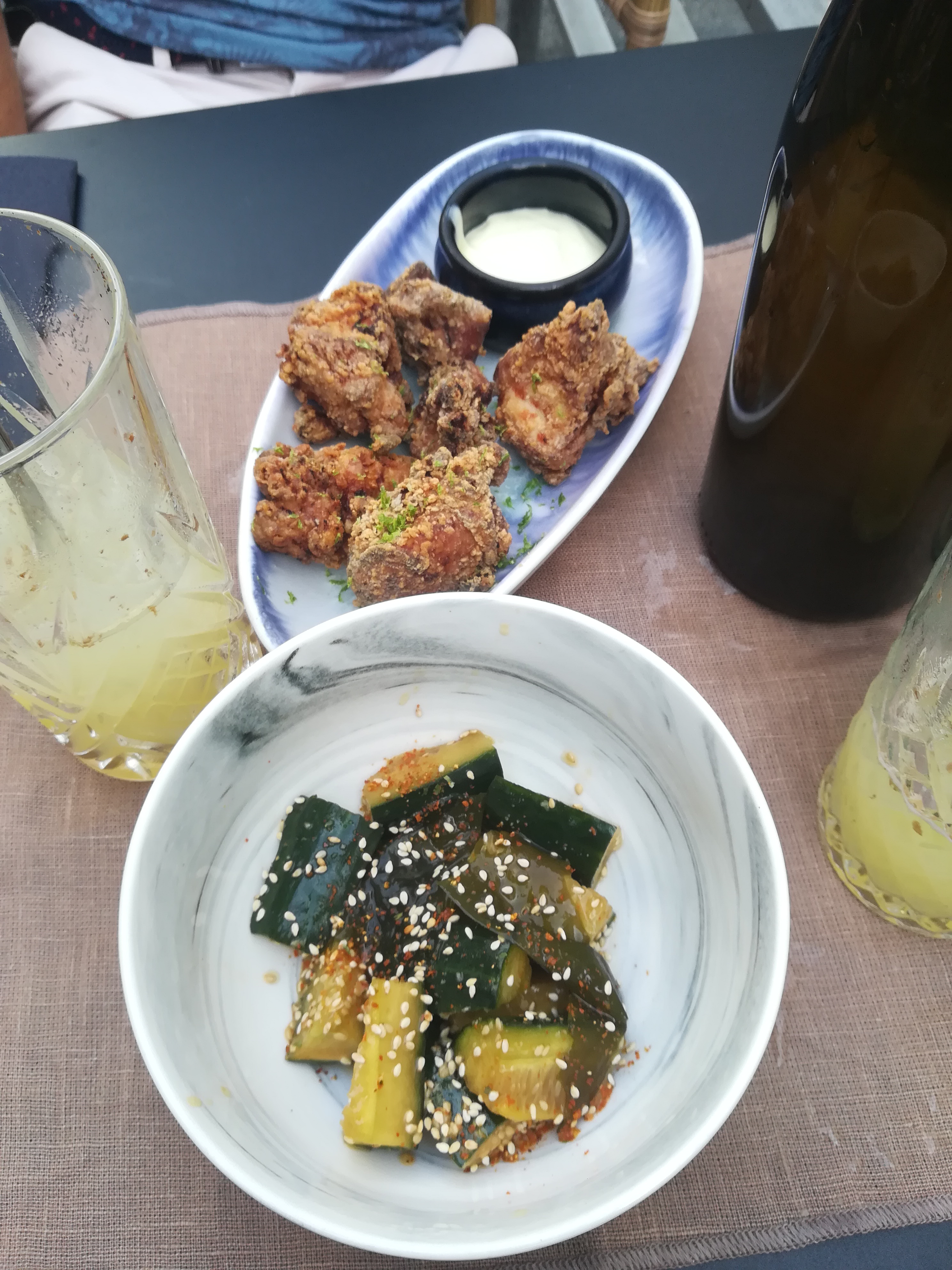 Adresse agréable et terrasse à l'ombre pour éviter les fortes chaleurs...plats aux noms japonais qui échappent vite, j'ai pris des concombres avec un assainissement très agréable...en revanche, le ramen au porc qui suivait et qui était suffisant pour être repu manquait peut-être un peu de poivre ou de sel, il m'a semblé un petit peu fade...je n'ai pas pris de dessert, tentants, mais je n'avais plus faim... jolie déco à l'intérieur et service souriant.