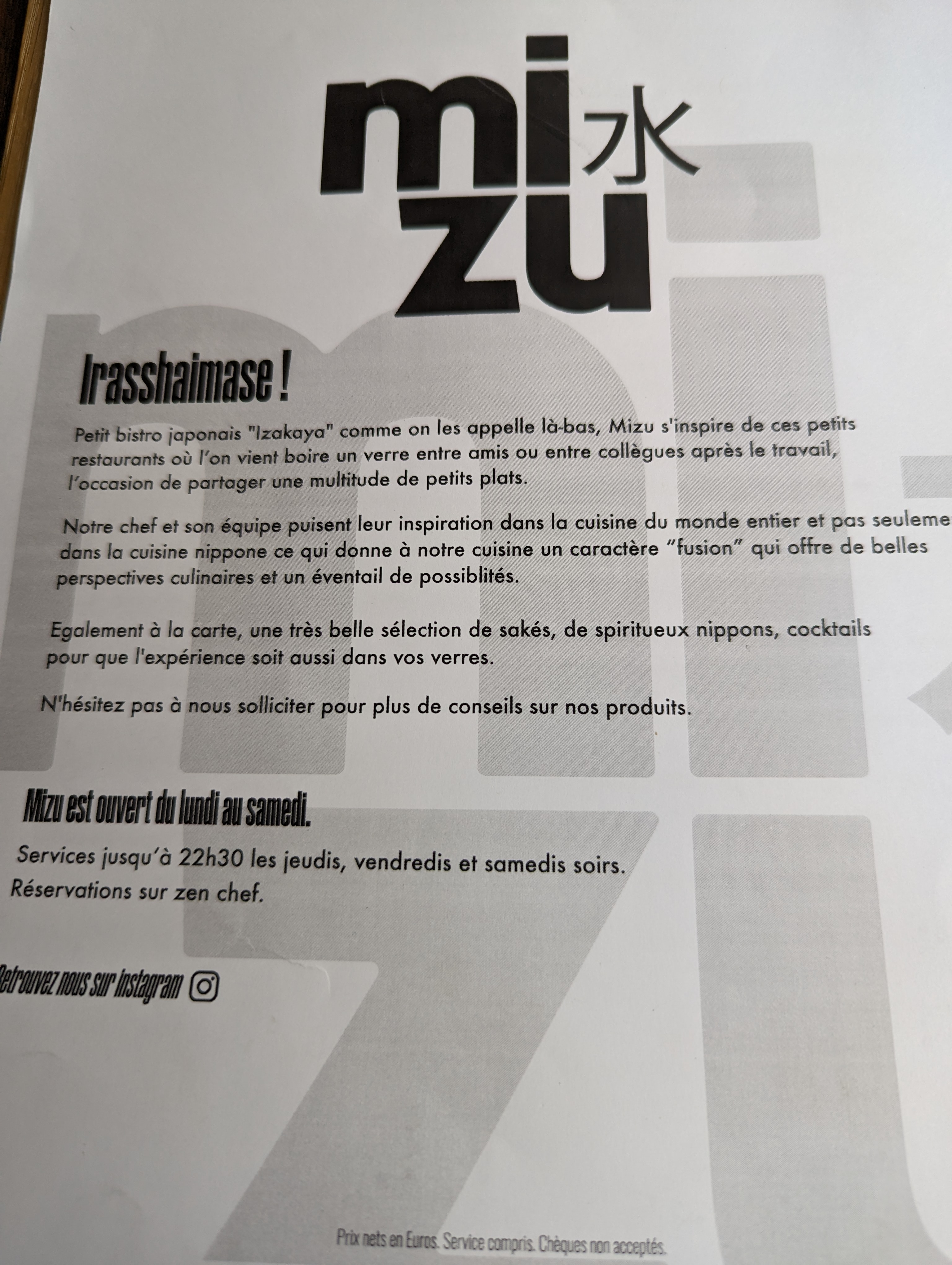 Toujours un plaisir de venir chez mizu. Service très agréable cuisine savoureuse , je recommande