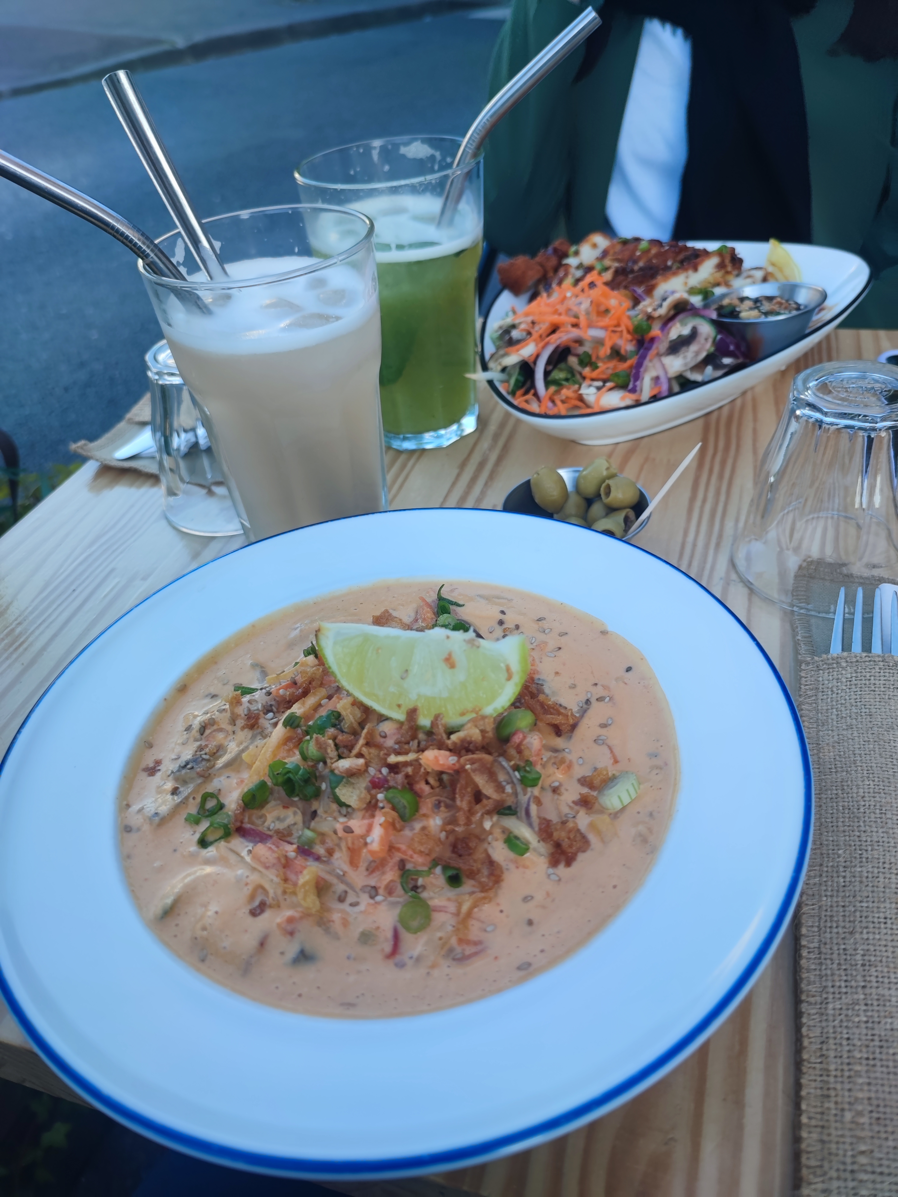 Restaurant accueillant , joli et épuré . J’ai command un plat crevette gnocchi sauce coco câpres . On m’a servi une soupe de lait de coco dans lequel baignait quelques gnocchi et seulement 3 crevettes . C’est un peu moyen pour un plat à base de crevettes. J’ai commandé un plat pas une soupe il faut revoir ce plat. Pas de menu au déjeuner ni dîner. Bel accueil et bel endroit tout de même.